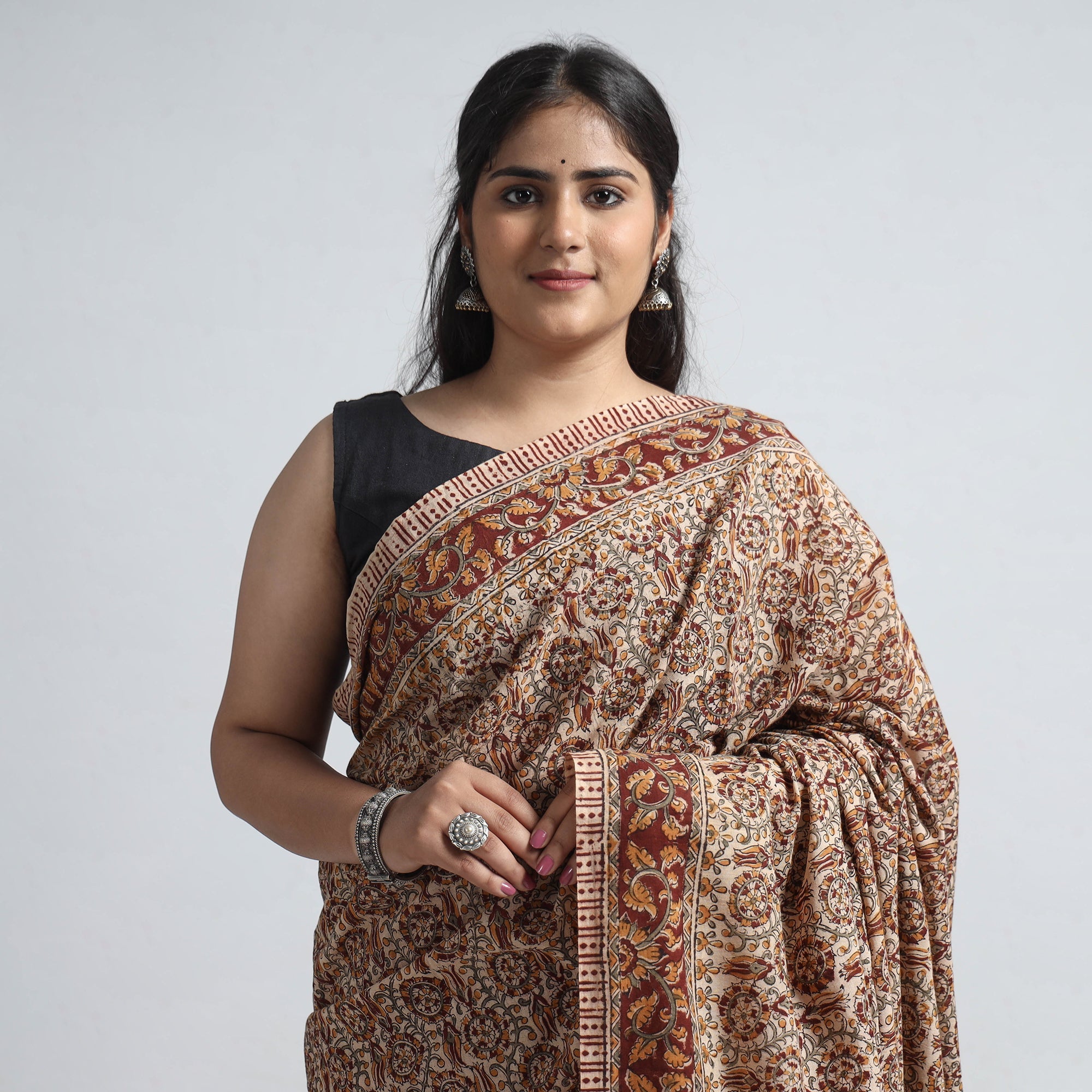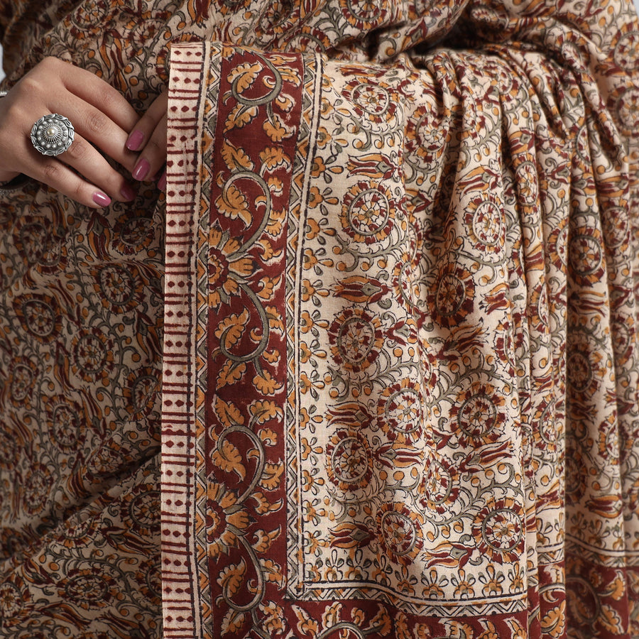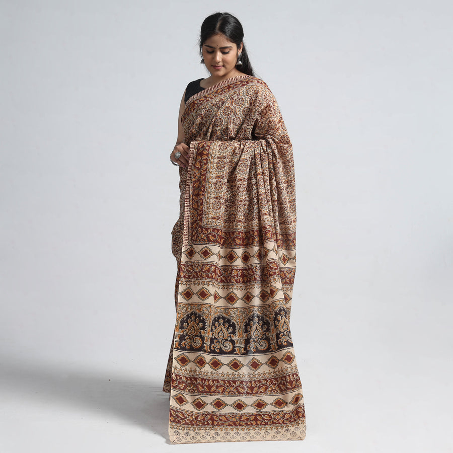 Fine-quality brown Kalamkari saree with block-printed. This kalamkari cotton saree features intricate designs and natural dyes, reflecting the rich tradition of Kalamkari art. Perfect for special occasions, it combines elegance with comfort. Celebrate Indian craftsmanship and support local artisans with this unique piece.