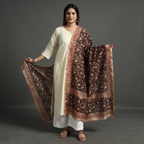 Fine quality black kalamkari hand block printed chanderi silk handloom dupatta with zari border. Kalamkari is the earliest and more complex techniques of block-printing. Showcasing an assortment of hand block printed motifs inspired by traditional kalamkari painting. This dupatta combines the elegance of chanderi silk with the intricate beauty of Kalamkari.