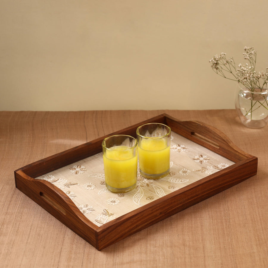 Intricate and artfully done beige lucknowi chikankari zari hand embroidered sheesham wood tray. This tray have acrylic transparent sheet cover on embroidered part to protect from food and liquid. Chikankari is a traditional textile decorative from Lucknow. It is very delicate and intricate hand embroidery work where thread is embroidered of cool, pastel shades on light fabrics.