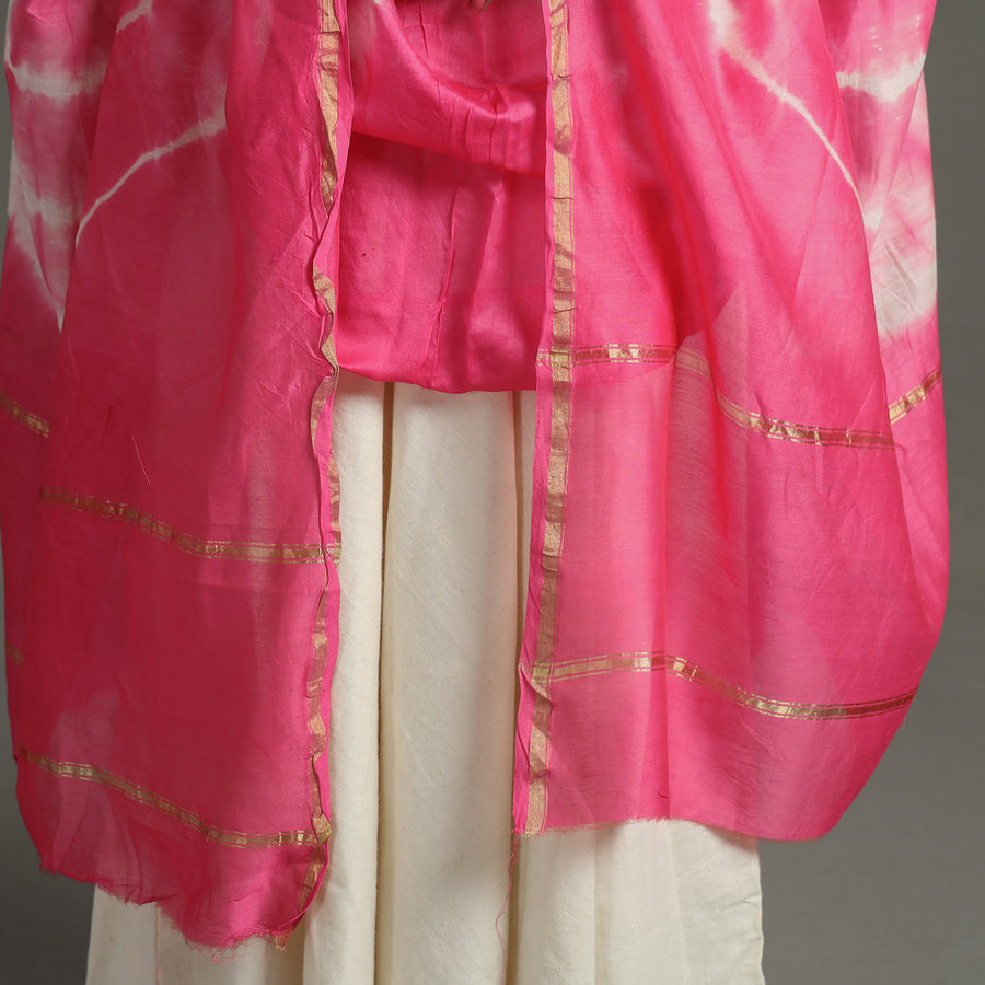 Fine quality shibori tie-dye handloom chanderi silk dupatta with zari border. This dupatta is hand dyed using shibori tie and dye technique in which the fabric is tied using clamp or stitches in the required design and the pattern is dyed. Chanderi silks are known for its gossamer looks and amazing feel. Chanderi weaving is practiced in the historic town of Chanderi in Madhya Pradesh.