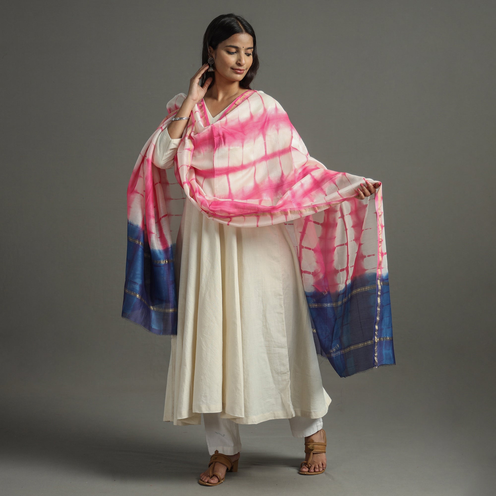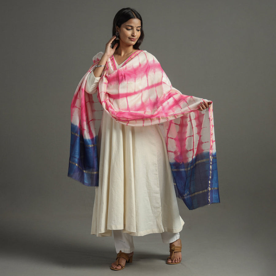 Fine quality shibori tie-dye handloom chanderi silk dupatta with zari border. This dupatta is hand dyed using shibori tie and dye technique in which the fabric is tied using clamp or stitches in the required design and the pattern is dyed. Chanderi silks are known for its gossamer looks and amazing feel. Chanderi weaving is practiced in the historic town of Chanderi in Madhya Pradesh.