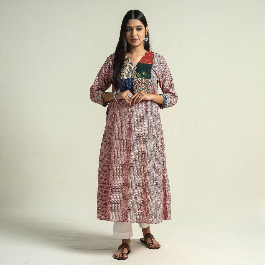 This uniquely designed block print cotton patchwork a-line bagh kurta is a perfect blend of style and comfort. This kurti is crafted from natural-dyed cotton fabric, ensuring a comfortable feel against your skin. The Kurta also features a convenient one-side pocket, perfect for carrying small essentials. This cotton Kurta makes you comfortable all day long. This Kurta is perfect for your daily outing and for a special occasion.