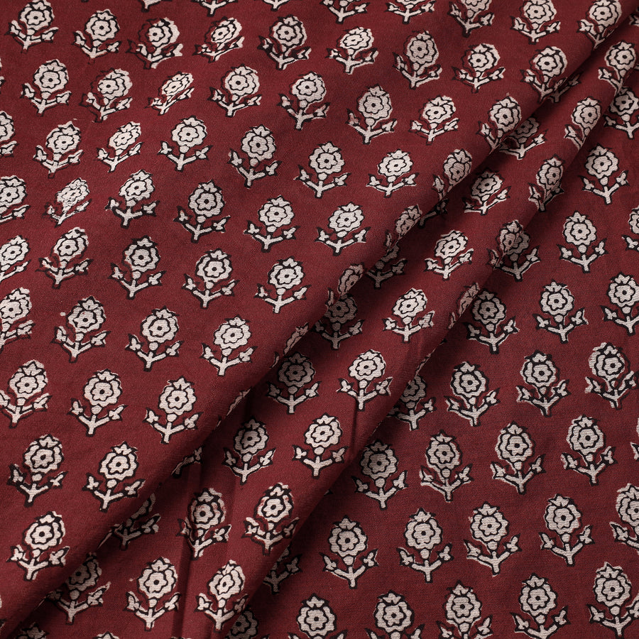 Fine-quality maroon bagh hand block printed chanderi silk cotton handloom fabric. Meticulously made by master artisan Umar Faruk Khatri, who practices the age-old art of Bagh block printing in the Dhar district of Madhya Pradesh, this fabric is a testament to skilled artistry. Using natural dyes and following traditional processes, each motif and pattern on the fabric is carefully hand block printed, creating a unique and exquisite design. The intricate and unique patterns make this fabric a perfect choice for a variety of projects, such as clothing, home decor, and accessories.