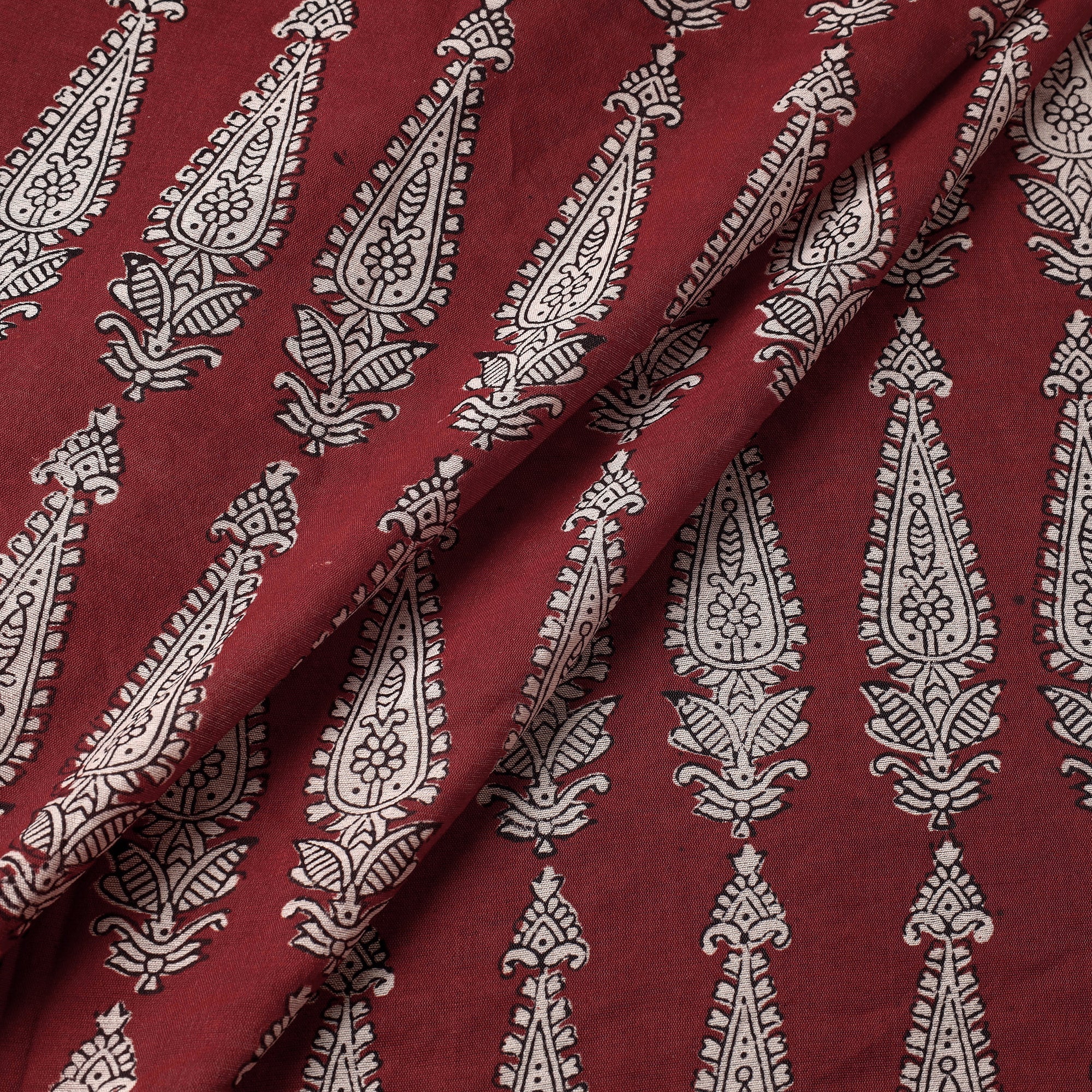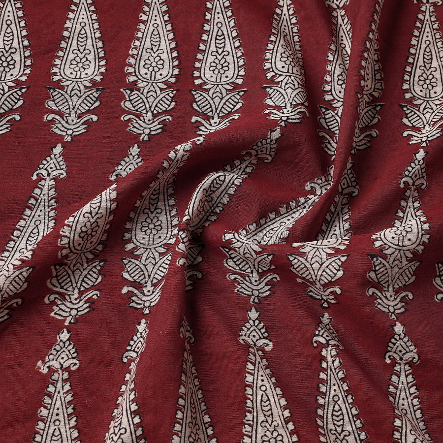 Fine-quality maroon bagh hand block printed chanderi silk cotton handloom fabric. Meticulously made by master artisan Umar Faruk Khatri, who practices the age-old art of Bagh block printing in the Dhar district of Madhya Pradesh, this fabric is a testament to skilled artistry. Using natural dyes and following traditional processes, each motif and pattern on the fabric is carefully hand block printed, creating a unique and exquisite design. The intricate and unique patterns make this fabric a perfect choice for a variety of projects, such as clothing, home decor, and accessories.