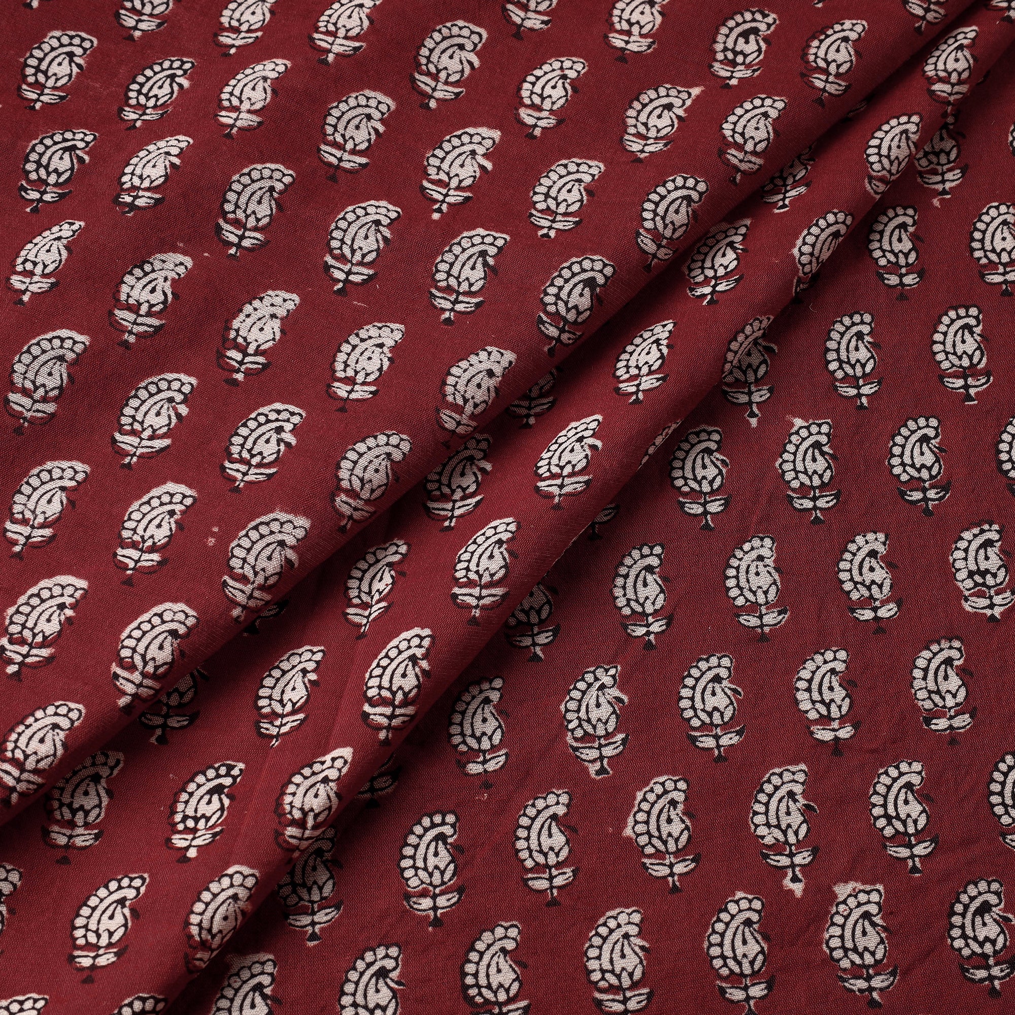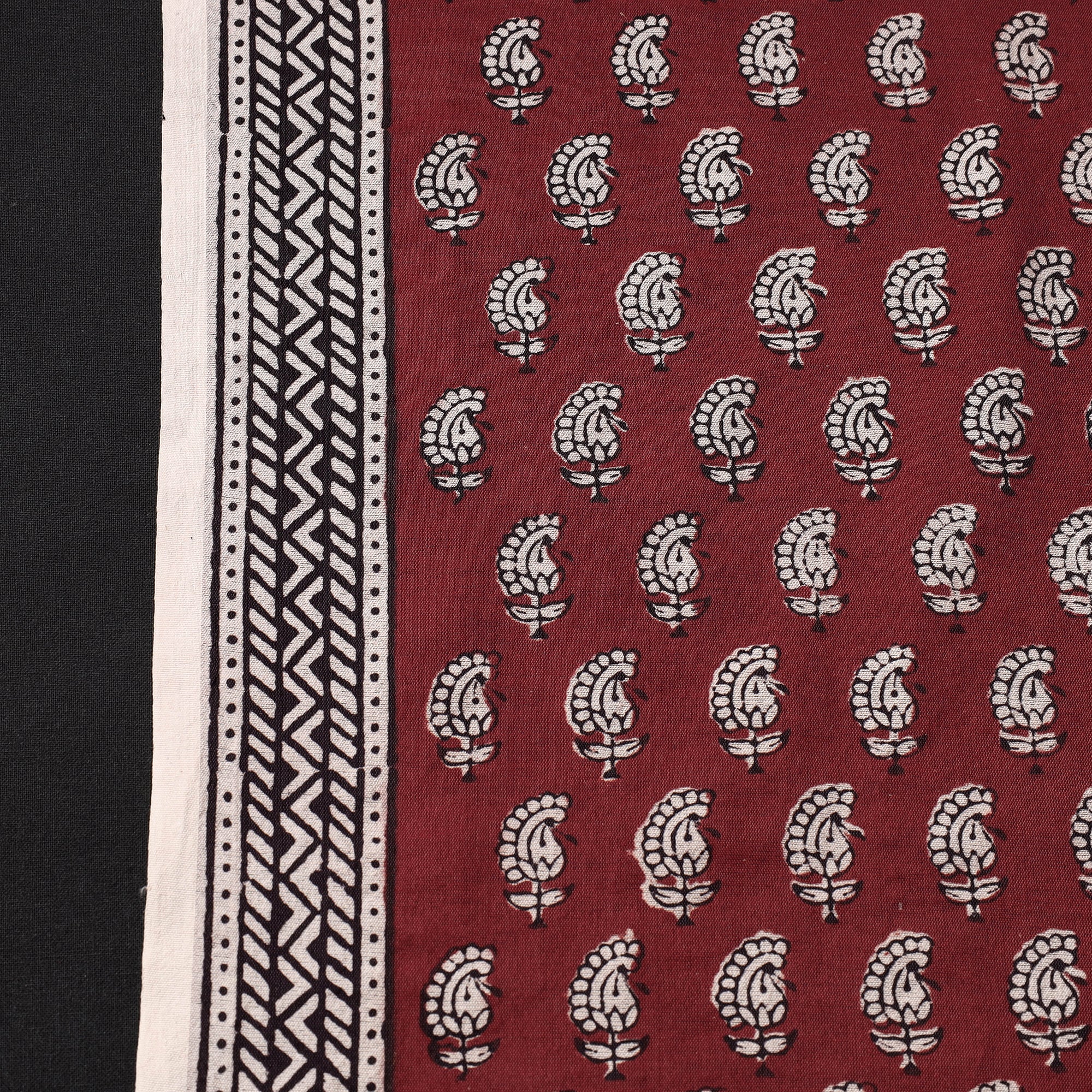 Fine-quality maroon bagh hand block printed chanderi silk cotton handloom fabric. Meticulously made by master artisan Umar Faruk Khatri, who practices the age-old art of Bagh block printing in the Dhar district of Madhya Pradesh, this fabric is a testament to skilled artistry. Using natural dyes and following traditional processes, each motif and pattern on the fabric is carefully hand block printed, creating a unique and exquisite design. The intricate and unique patterns make this fabric a perfect choice for a variety of projects, such as clothing, home decor, and accessories.