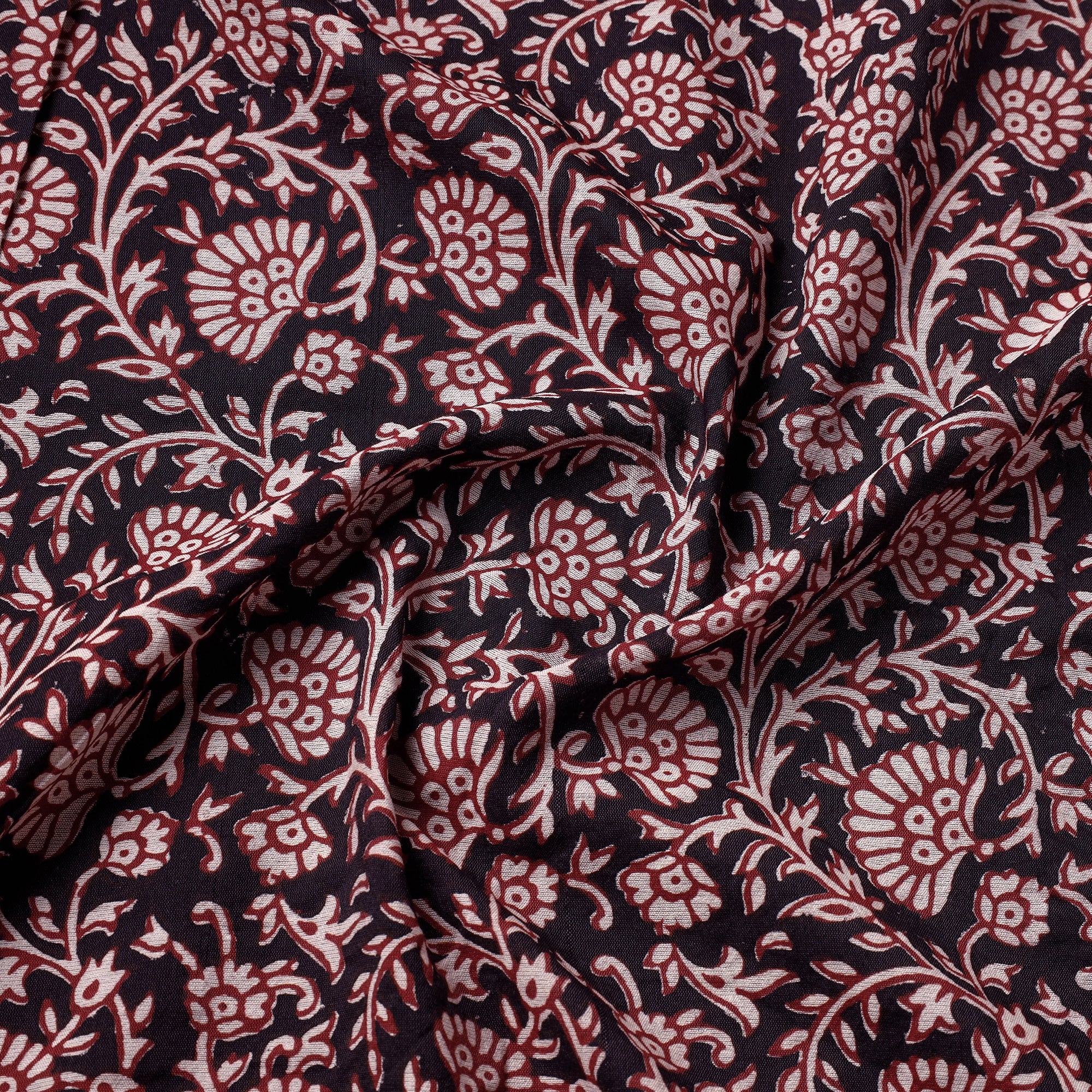 Fine-quality black bagh hand block printed chanderi silk cotton handloom fabric. Meticulously made by master artisan Umar Faruk Khatri, who practices the age-old art of Bagh block printing in the Dhar district of Madhya Pradesh, this fabric is a testament to skilled artistry. Using natural dyes and following traditional processes, each motif and pattern on the fabric is carefully hand block printed, creating a unique and exquisite design. The intricate and unique patterns make this fabric a perfect choice for a variety of projects, such as clothing, home decor, and accessories.