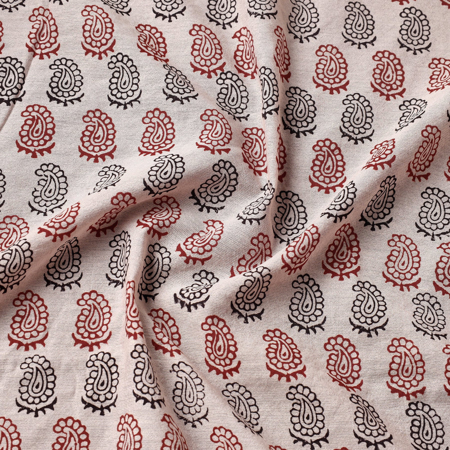 Fine-quality beige bagh hand block printed chanderi silk cotton handloom fabric. Meticulously made by master artisan Umar Faruk Khatri, who practices the age-old art of Bagh block printing in the Dhar district of Madhya Pradesh, this fabric is a testament to skilled artistry. Using natural dyes and following traditional processes, each motif and pattern on the fabric is carefully hand block printed, creating a unique and exquisite design. The intricate and unique patterns make this fabric a perfect choice for a variety of projects, such as clothing, home decor, and accessories.