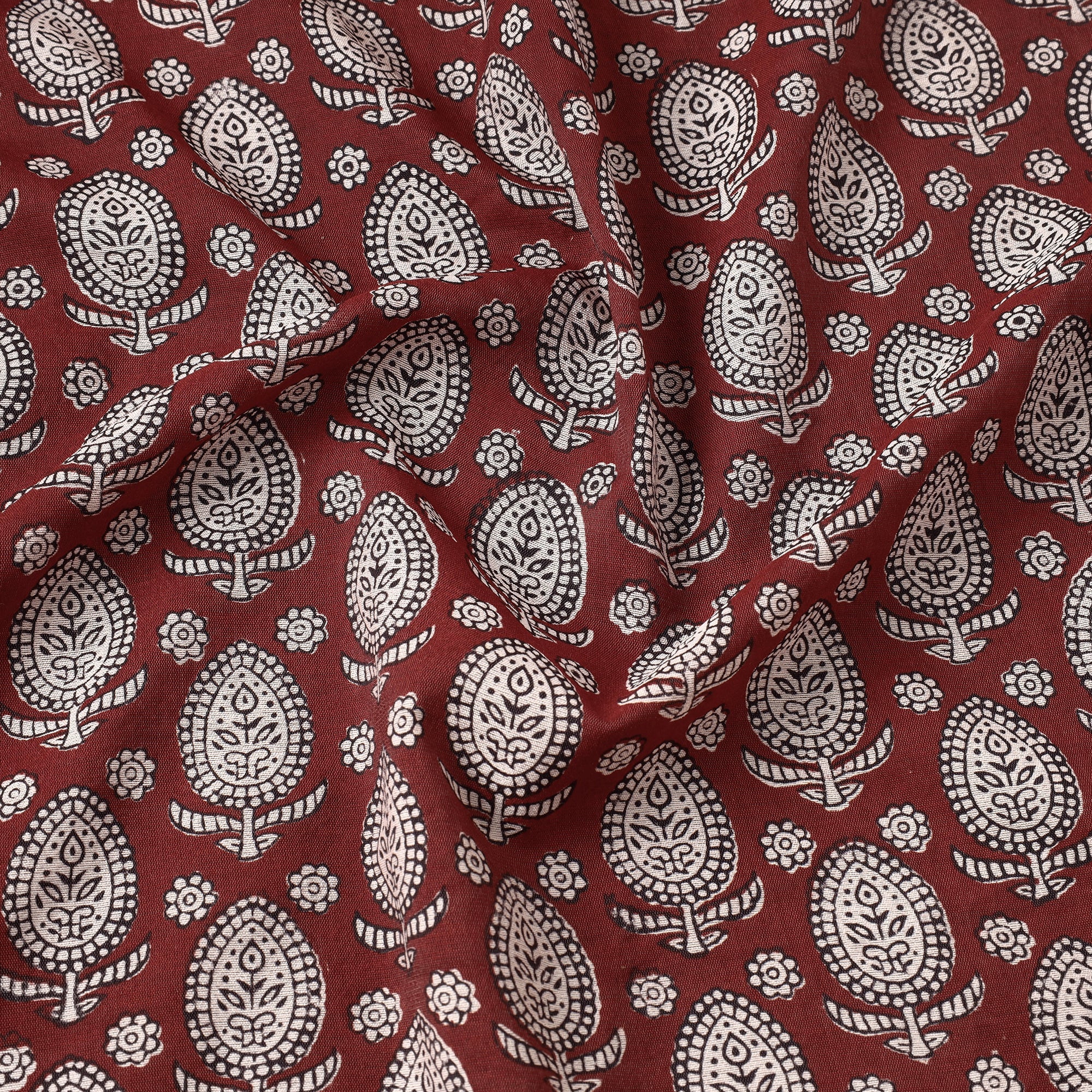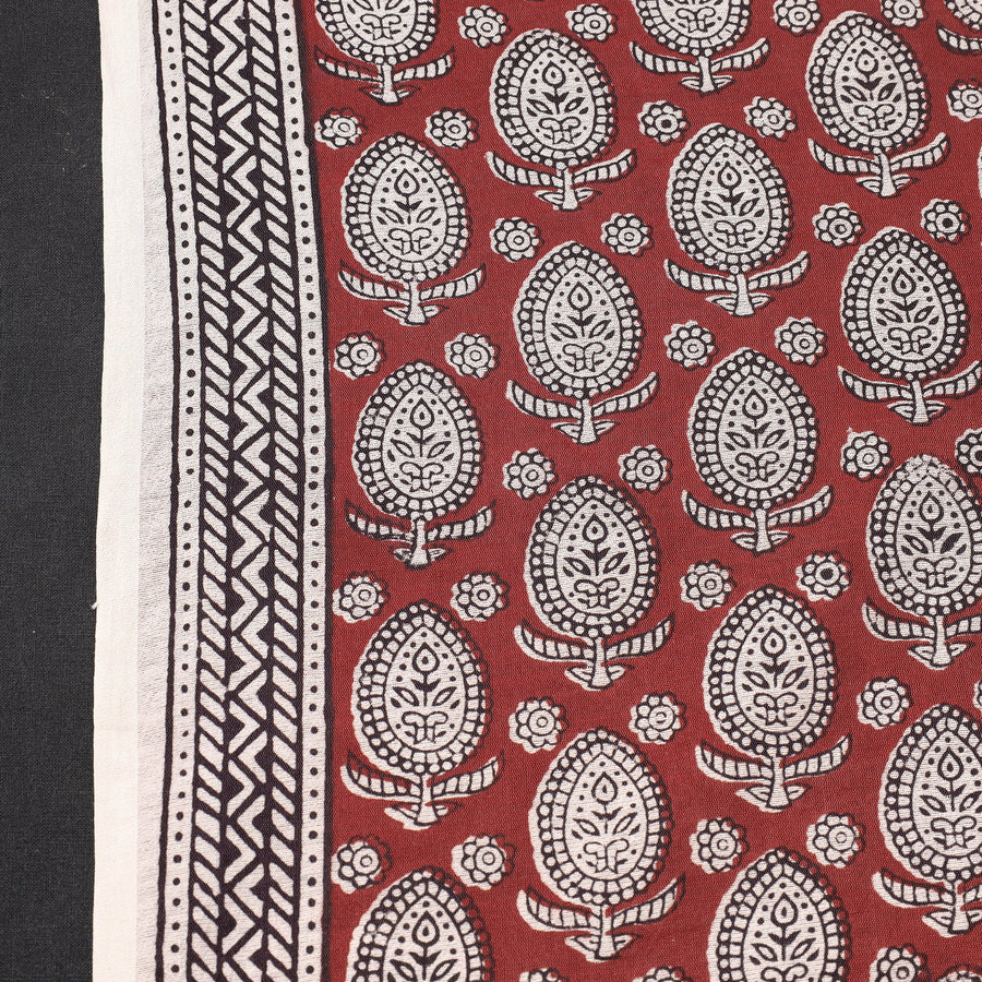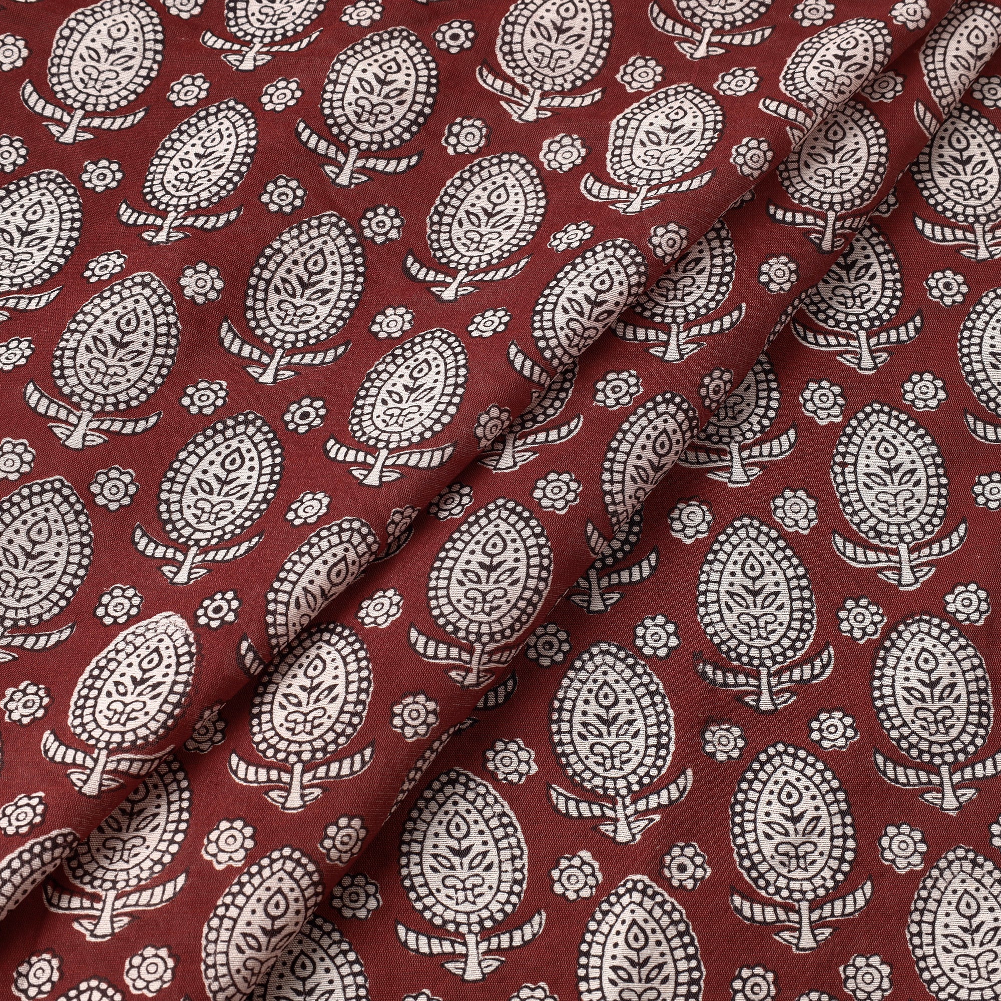Fine-quality maroon bagh hand block printed chanderi silk cotton handloom fabric. Meticulously made by master artisan Umar Faruk Khatri, who practices the age-old art of Bagh block printing in the Dhar district of Madhya Pradesh, this fabric is a testament to skilled artistry. Using natural dyes and following traditional processes, each motif and pattern on the fabric is carefully hand block printed, creating a unique and exquisite design. The intricate and unique patterns make this fabric a perfect choice for a variety of projects, such as clothing, home decor, and accessories.