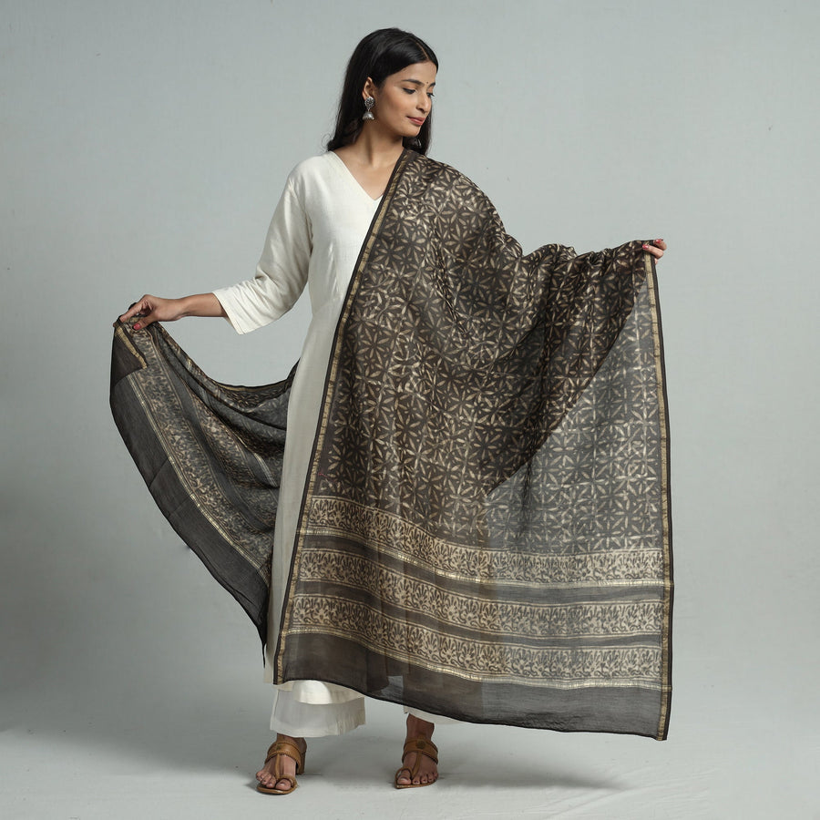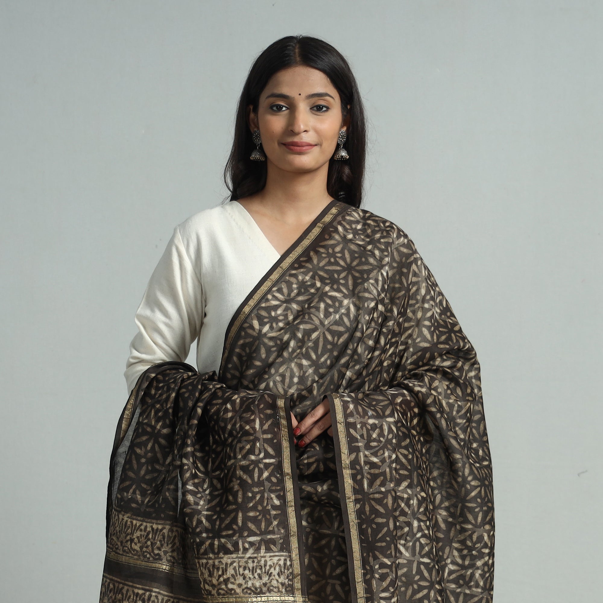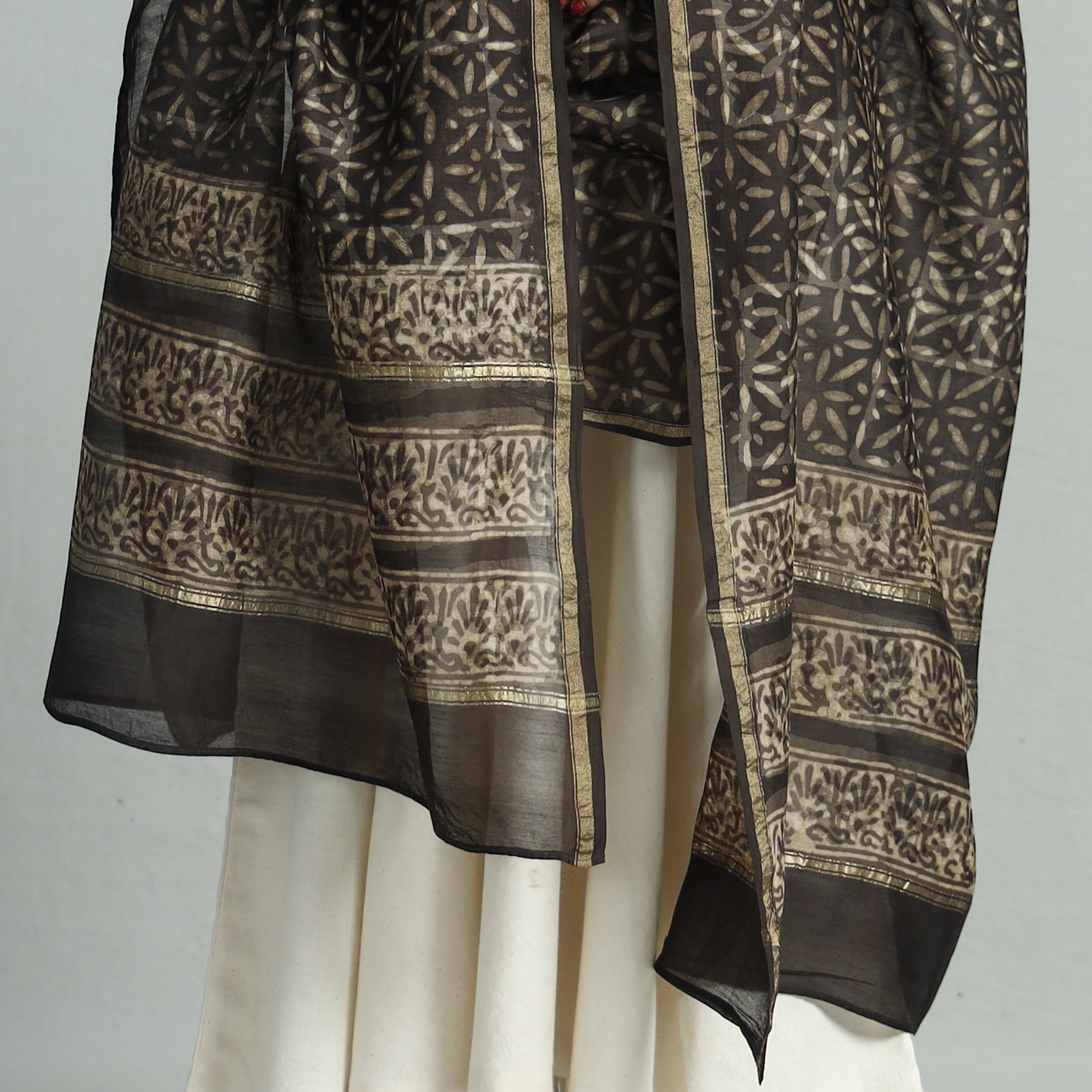 This pipad hand block printed dupatta with zari border is made from chanderi silk-cotton known for its gossamer looks and amazing feel. The use of natural dyes adds to the quality of the product, making it eco-friendly and safe for you to wear. It's made using a traditional mud-resist process by Chhipa Azhar, a renowned artisan from Pipar, Rajasthan. The process involves using mud to create a resist on the fabric, which is then block-printed with intricate designs using a wooden block. The result is a beautifully crafted dupatta that is unique and reflects the rich cultural heritage of Rajasthan.