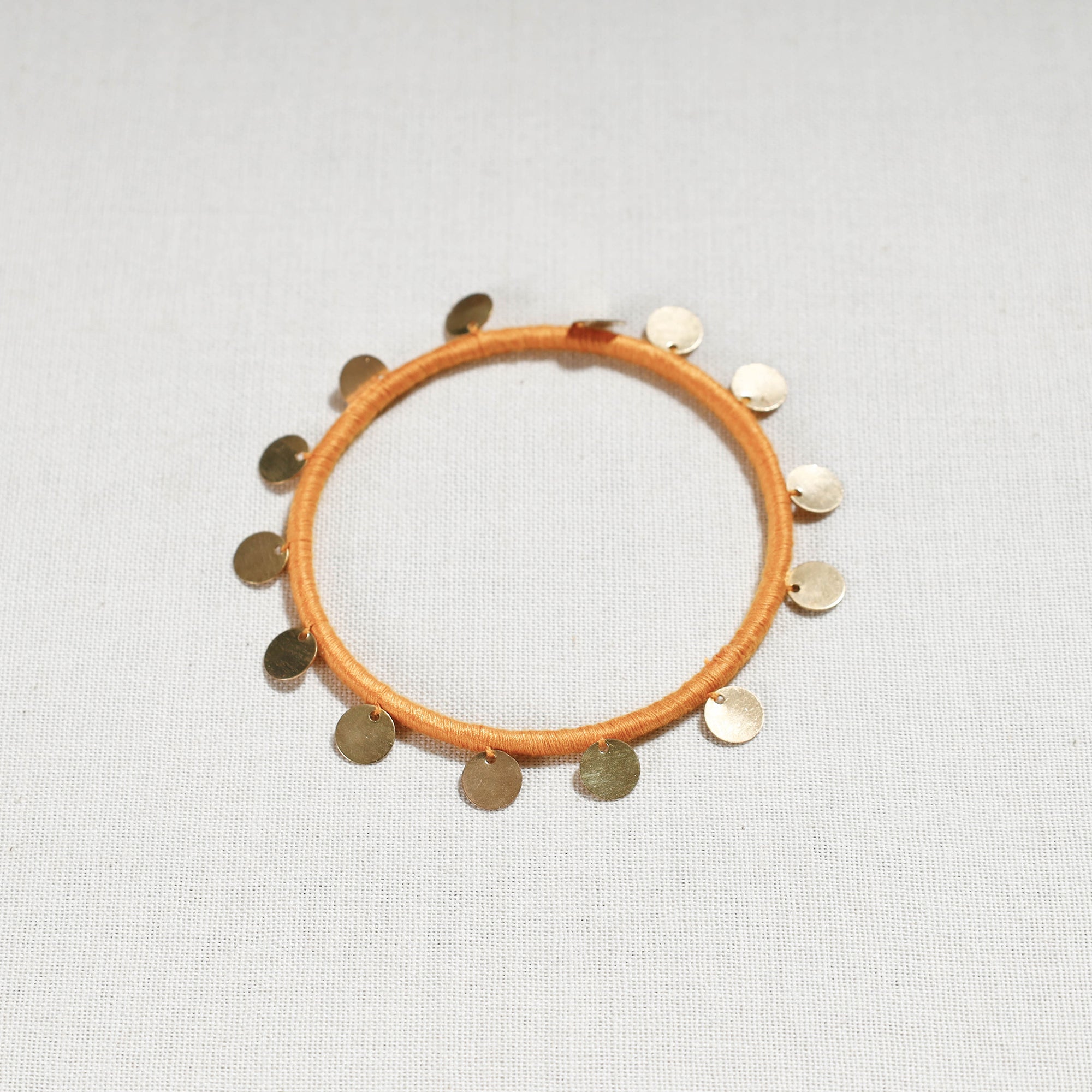 Orange patwa bangle is made from thick weaves of thread and sequin work, handcrafted by the master craftsmen Kailash Patwa. Patwa is a thread craft that originated in Rajasthan and is now practised in parts of the state. Patwa is derived from the Hindi word 'pat,' which means silk, and those involved in the silk and cotton thread business are known as Patwas.