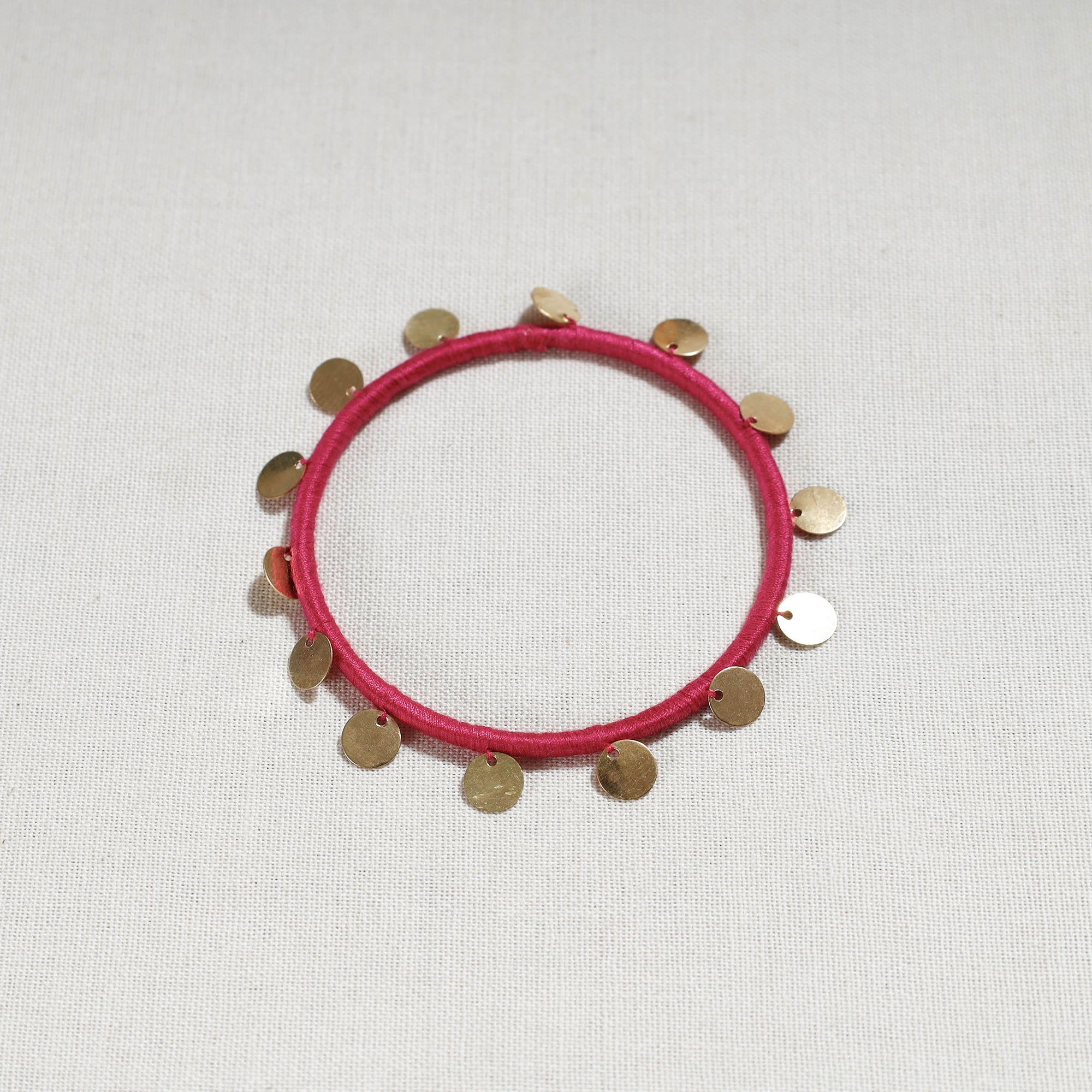Red patwa bangle is made from thick weaves of thread and sequin work, handcrafted by the master craftsmen Kailash Patwa. Patwa is a thread craft that originated in Rajasthan and is now practised in parts of the state. Patwa is derived from the Hindi word 'pat,' which means silk, and those involved in the silk and cotton thread business are known as Patwas.
