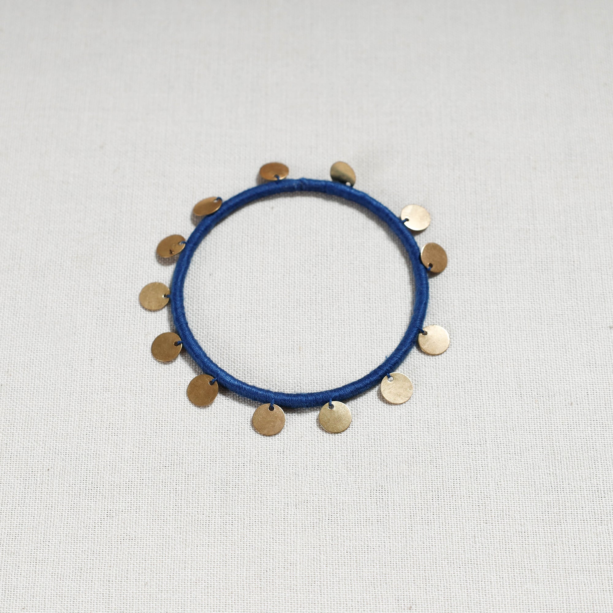 Blue patwa bangle is made from thick weaves of thread and sequin work, handcrafted by the master craftsmen Kailash Patwa. Patwa is a thread craft that originated in Rajasthan and is now practised in parts of the state. Patwa is derived from the Hindi word 'pat,' which means silk, and those involved in the silk and cotton thread business are known as Patwas.