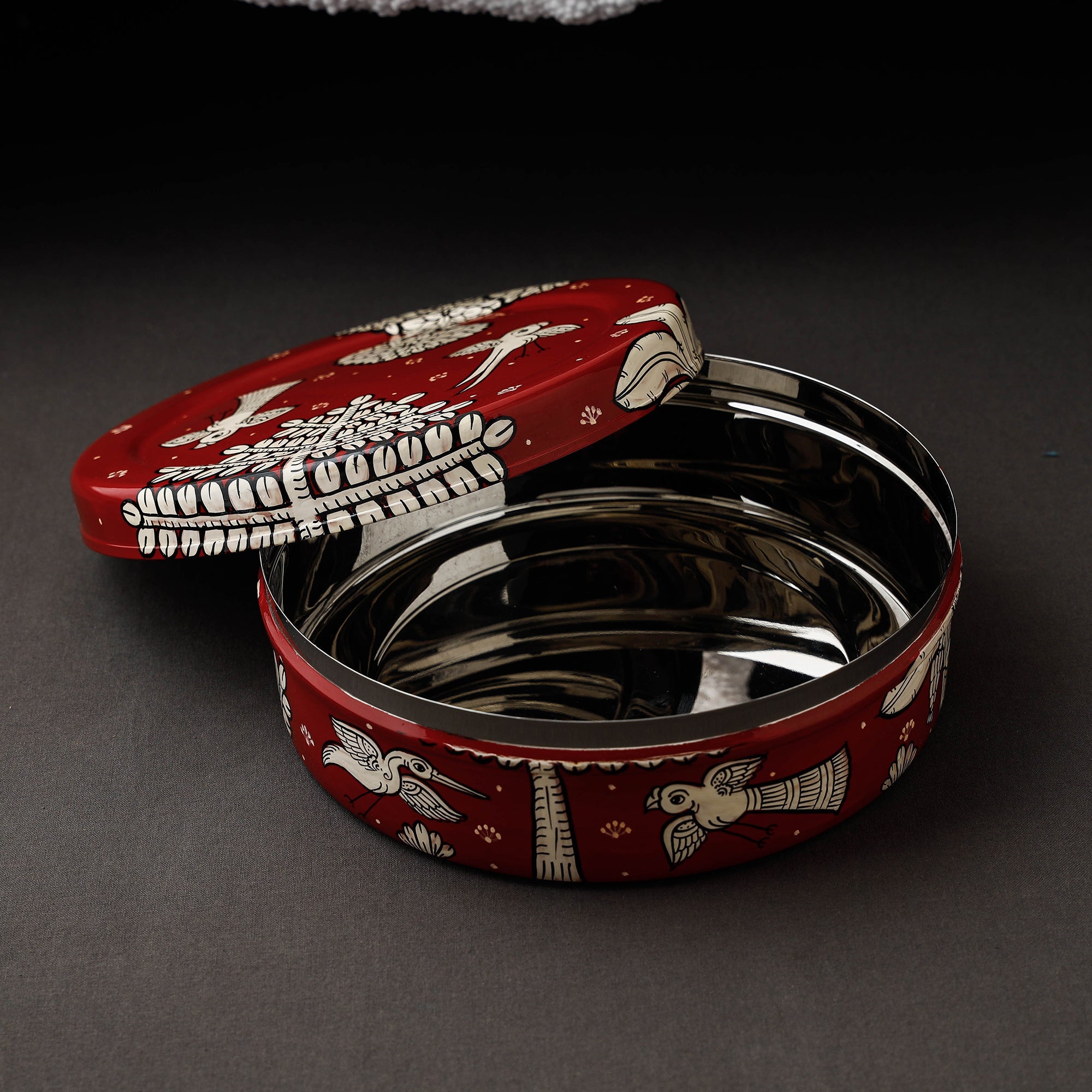Red pattachitra painting with waterproof acrylic paint on very high quality stainless steel casserole by the artisans of Odisha. This exquisite casserole is designed to enhance your dining experience while keeping your chapatis fresh and warm. It is crafted from stainless steel and features waterproof acrylic paint, ensuring both durability and longevity.