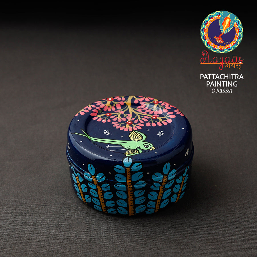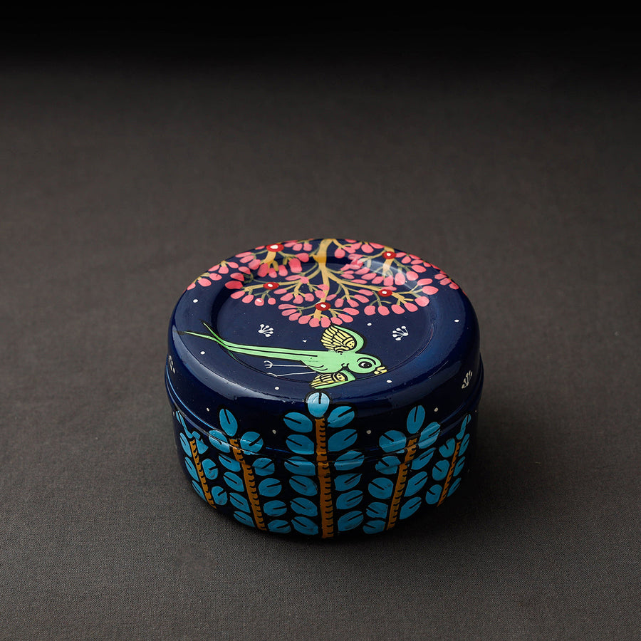 Blue pattachitra handpainted stainless steel multi-utility container, made by skilled artisans of Odisha. It showcases intricate designs in waterproof acrylic paint. This versatile container adds a touch of culture to your home while storing a variety of items, making it both functional and decorative.