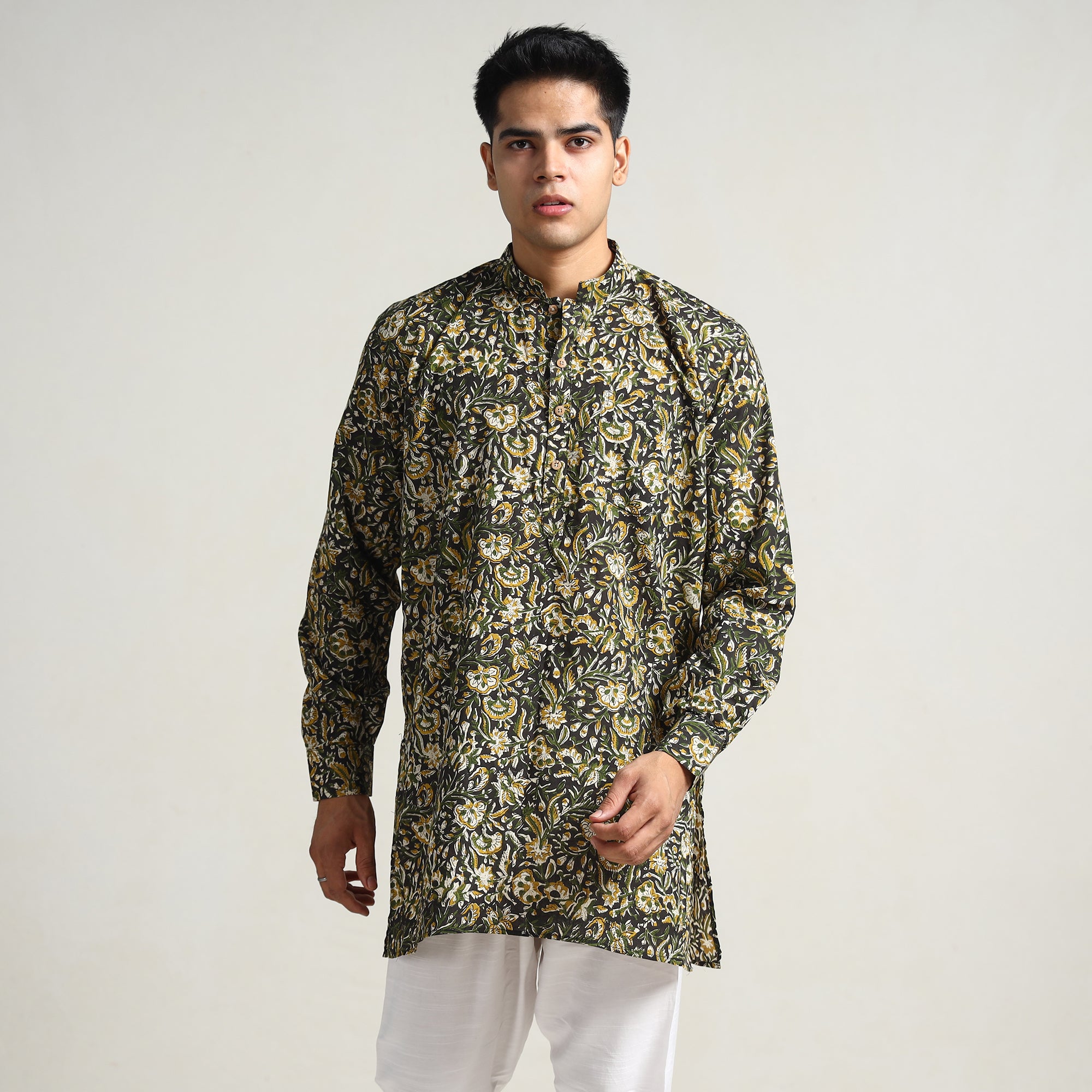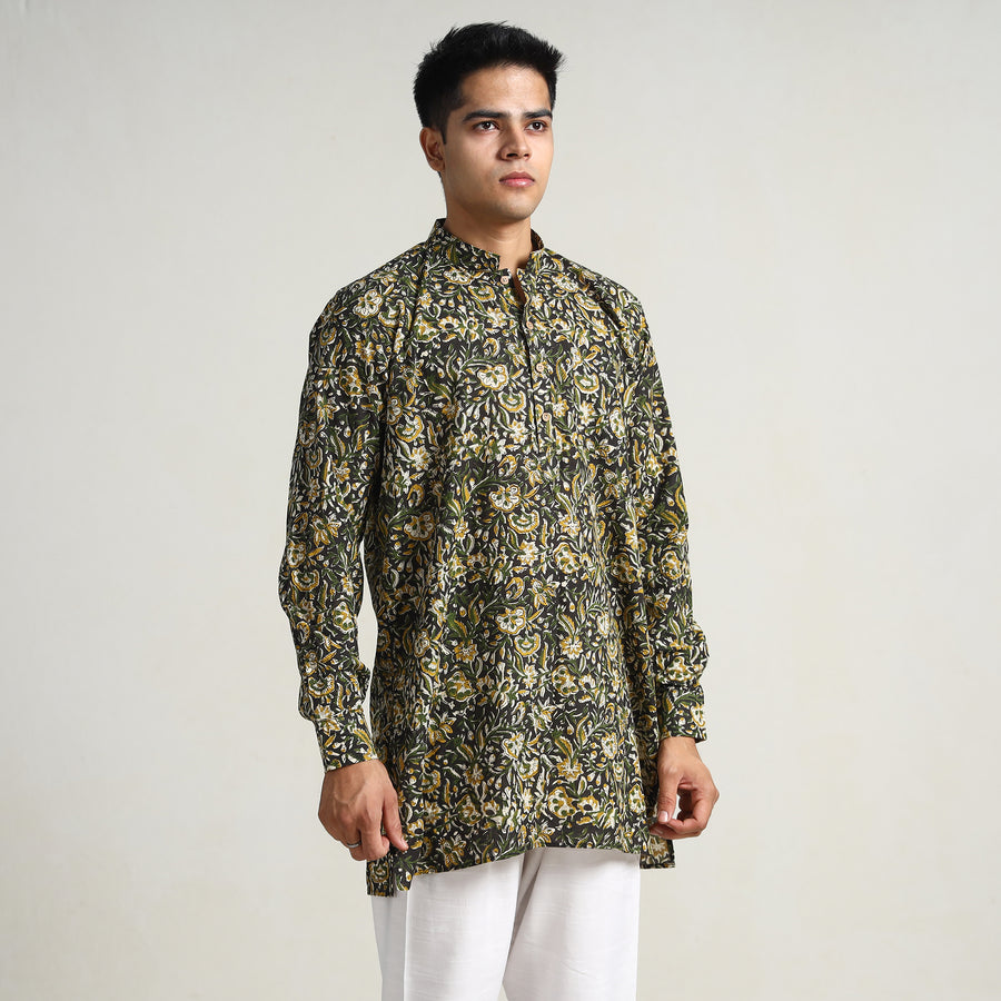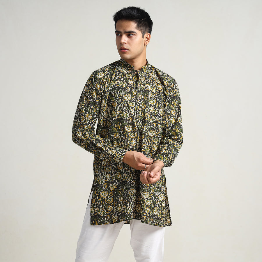 Bagru block printed cotton men's short kurta with one chest pocket, makes you comfortable with ease all day long. It's made from cotton fabric and features full sleeves, a front button placket. This casual kurta is perfect for your daily outing and for a special occasion. Made using natural dyes through traditional mud resist process by using hand carved wooden block practiced in Bagru, Rajasthan.
