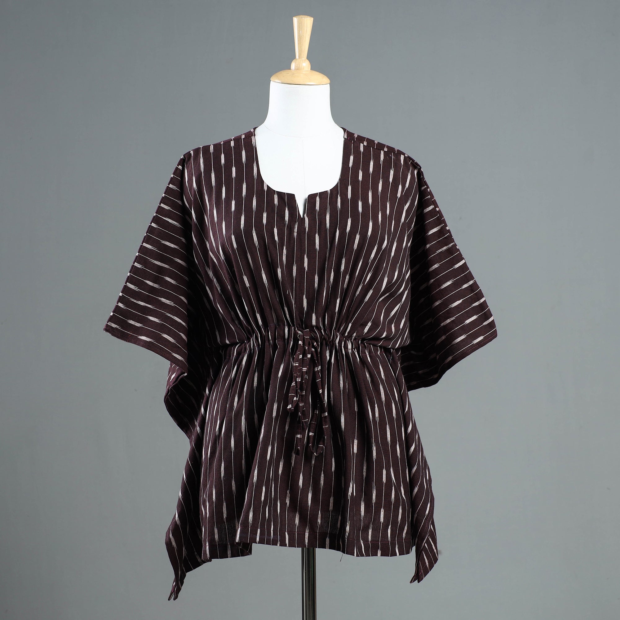 Fine quality pochampally ikat weave cotton short kaftan with adjustable drawstring waist tie. A traditional kaftan or caftan is an short length garment with long, flowing sleeves. These loose-fitting cotton kaftans are enhanced by a soft touch and beautiful ikat weave pattern. This dress will allow you to move with ease and comfort. The drawstring waist tie will give you the freedom to customize the fit to suit your unique shape. The kaftan is free-size and can be adjusted to perfection with the drawstring at the waist.