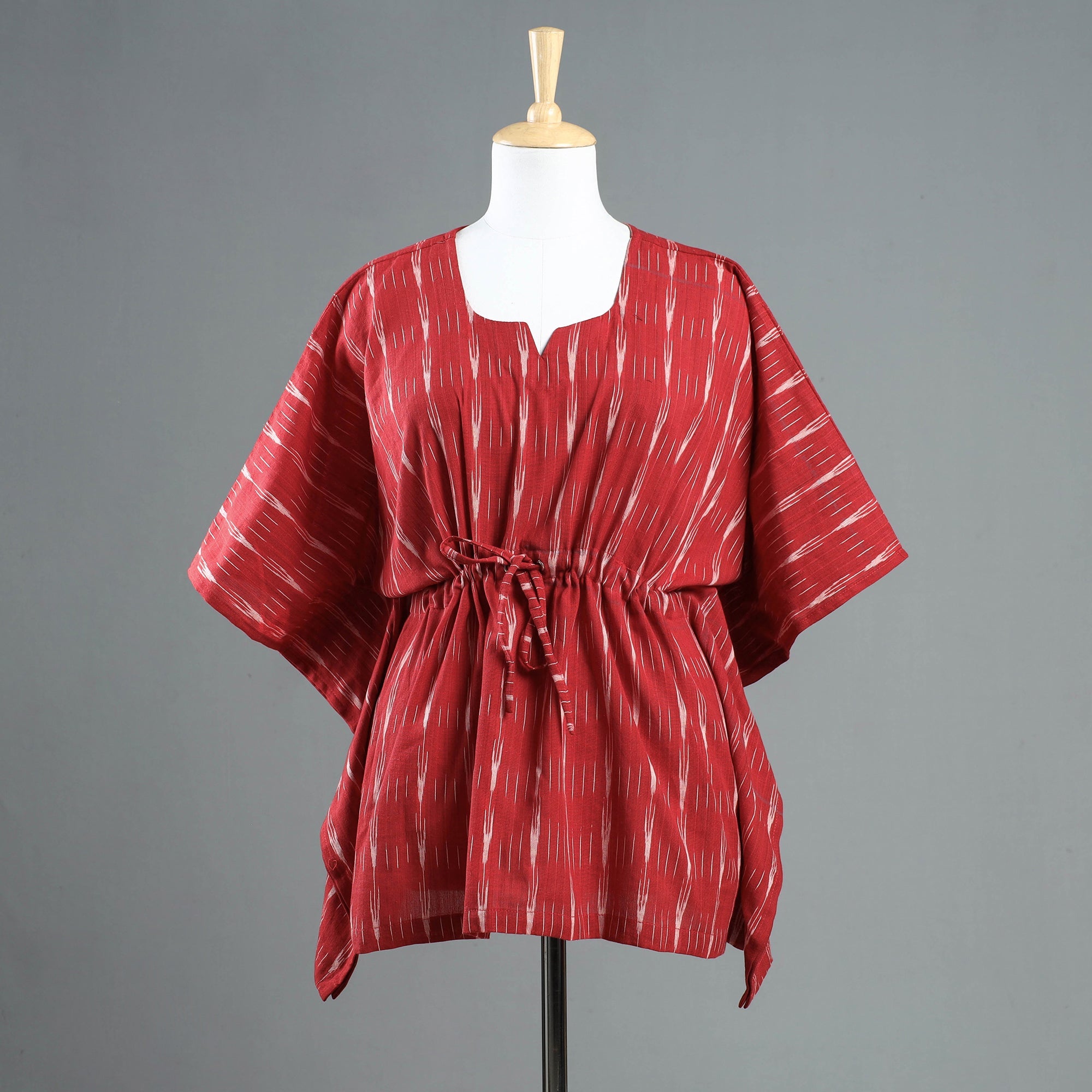 Fine quality pochampally ikat weave cotton short kaftan with adjustable drawstring waist tie. A traditional kaftan or caftan is an short length garment with long, flowing sleeves. These loose-fitting cotton kaftans are enhanced by a soft touch and beautiful ikat weave pattern. This dress will allow you to move with ease and comfort. The drawstring waist tie will give you the freedom to customize the fit to suit your unique shape. The kaftan is free-size and can be adjusted to perfection with the drawstring at the waist.