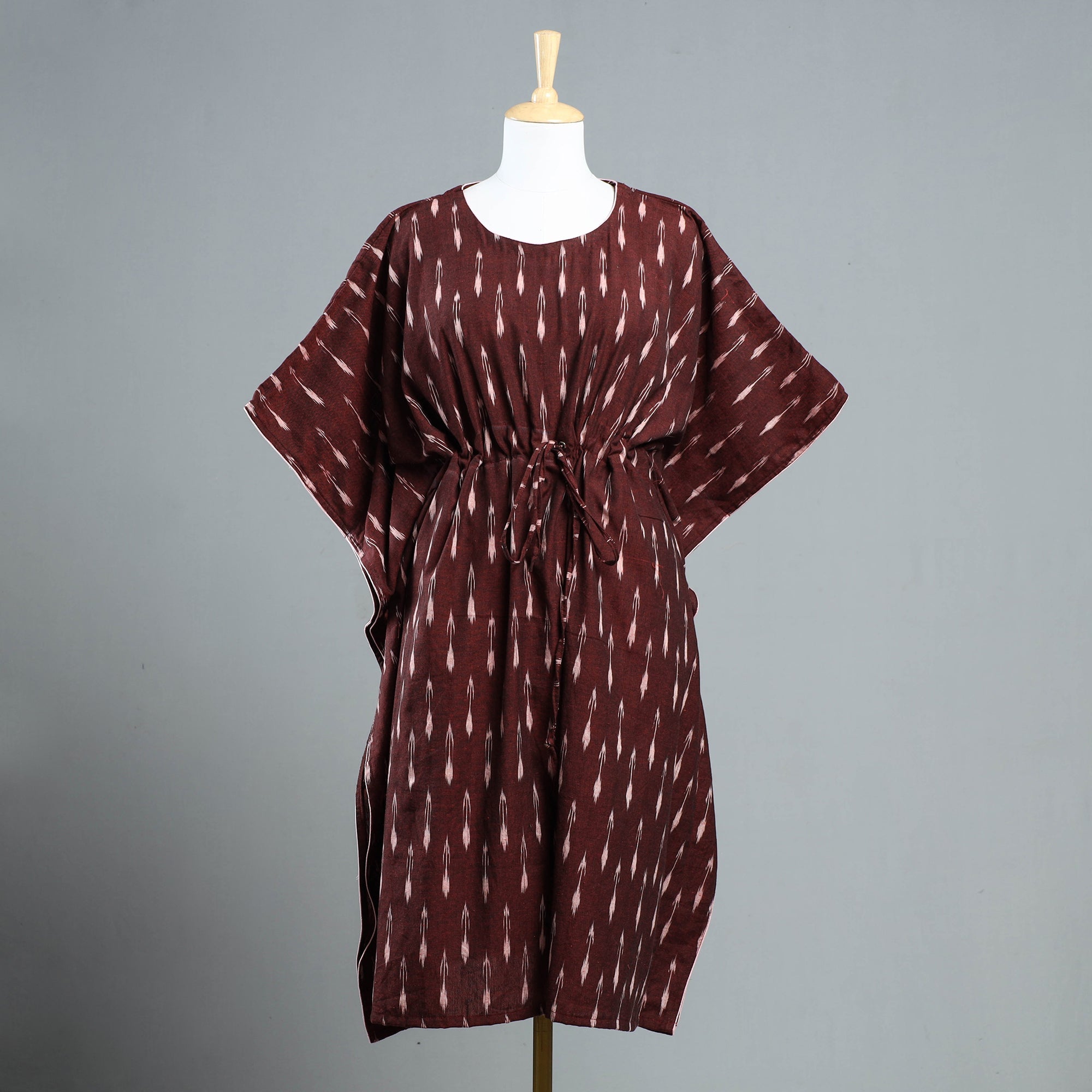 Fine quality pochampally ikat weave cotton medium kaftan with adjustable drawstring waist tie. A traditional kaftan or caftan is an knee-length garment garment with long, flowing sleeves. These loose-fitting cotton kaftans are enhanced by a soft touch and beautiful ikat weave pattern. This dress will allow you to move with ease and comfort. The drawstring waist tie will give you the freedom to customize the fit to suit your unique shape. The kaftan is free-size and can be adjusted to perfection with the drawstring at the waist.