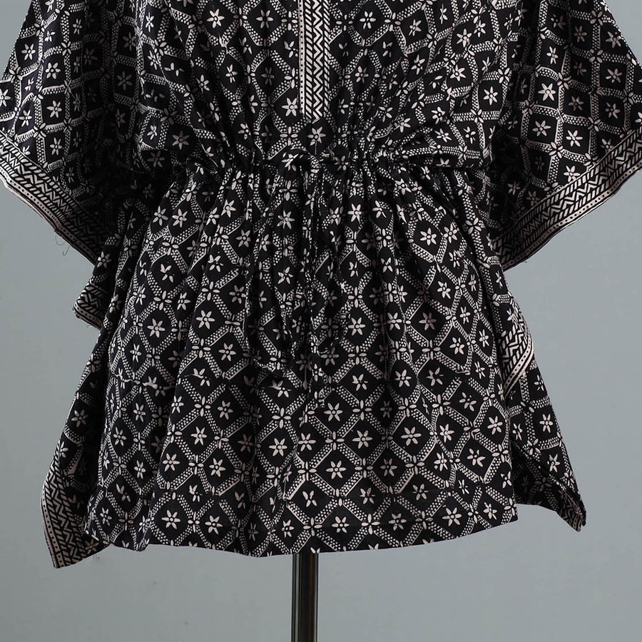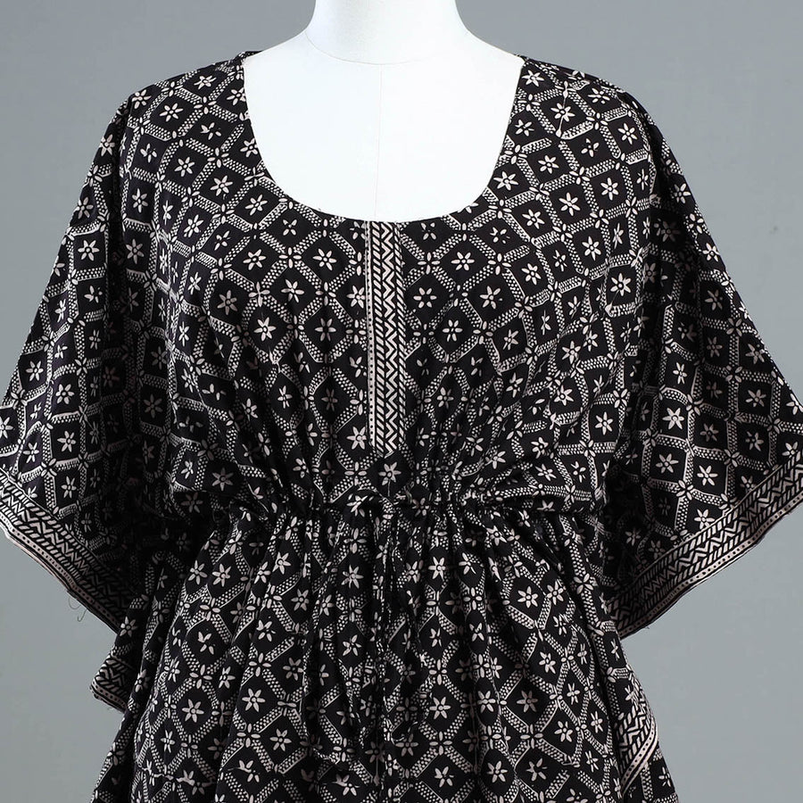 Fine quality bagh hand block printed cotton short kaftan with adjustable drawstring waist tie. A traditional kaftan or caftan is a short-length garment with long, flowing sleeves. These loose-fitting cotton kaftans are enhanced by a soft touch and beautiful hand-block prints. This dress will allow you to move with ease and comfort. The drawstring waist tie will give you the freedom to customize the fit to suit your unique shape. The kaftan is free-size and can be adjusted to perfection with the drawstring at the waist.