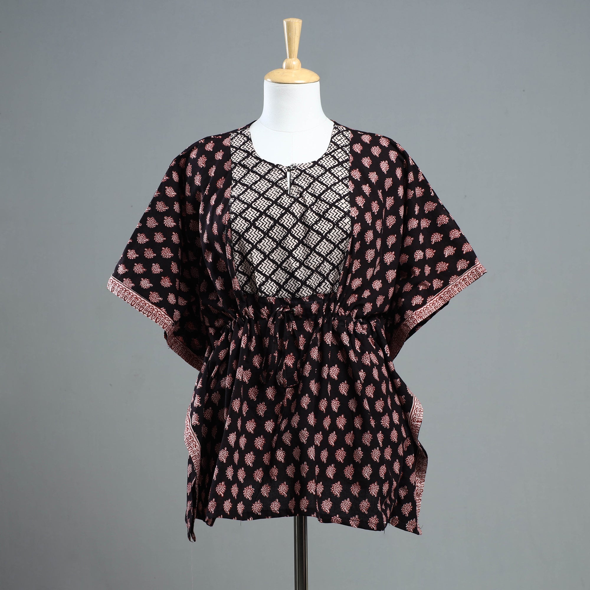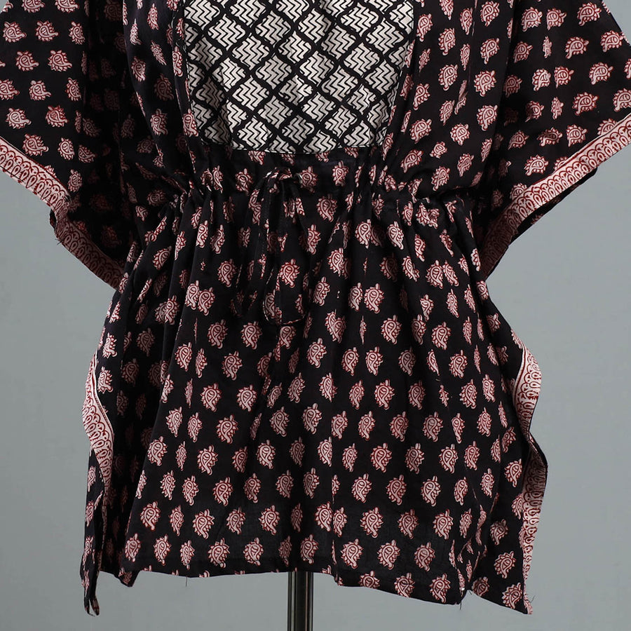 Fine quality bagh hand block printed cotton short kaftan with adjustable drawstring waist tie. A traditional kaftan or caftan is a short-length garment with long, flowing sleeves. These loose-fitting cotton kaftans are enhanced by a soft touch and beautiful hand-block prints. This dress will allow you to move with ease and comfort. The drawstring waist tie will give you the freedom to customize the fit to suit your unique shape. The kaftan is free-size and can be adjusted to perfection with the drawstring at the waist.