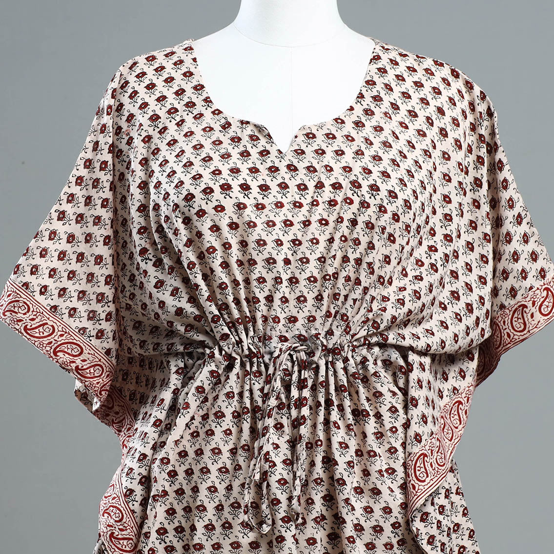 Fine quality bagh hand block printed cotton short kaftan with adjustable drawstring waist tie. A traditional kaftan or caftan is a short-length garment with long, flowing sleeves. These loose-fitting cotton kaftans are enhanced by a soft touch and beautiful hand-block prints. This dress will allow you to move with ease and comfort. The drawstring waist tie will give you the freedom to customize the fit to suit your unique shape. The kaftan is free-size and can be adjusted to perfection with the drawstring at the waist.