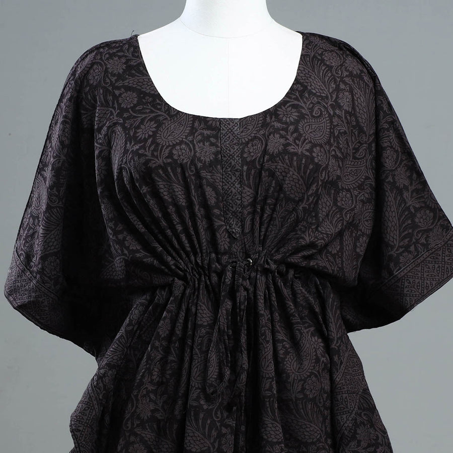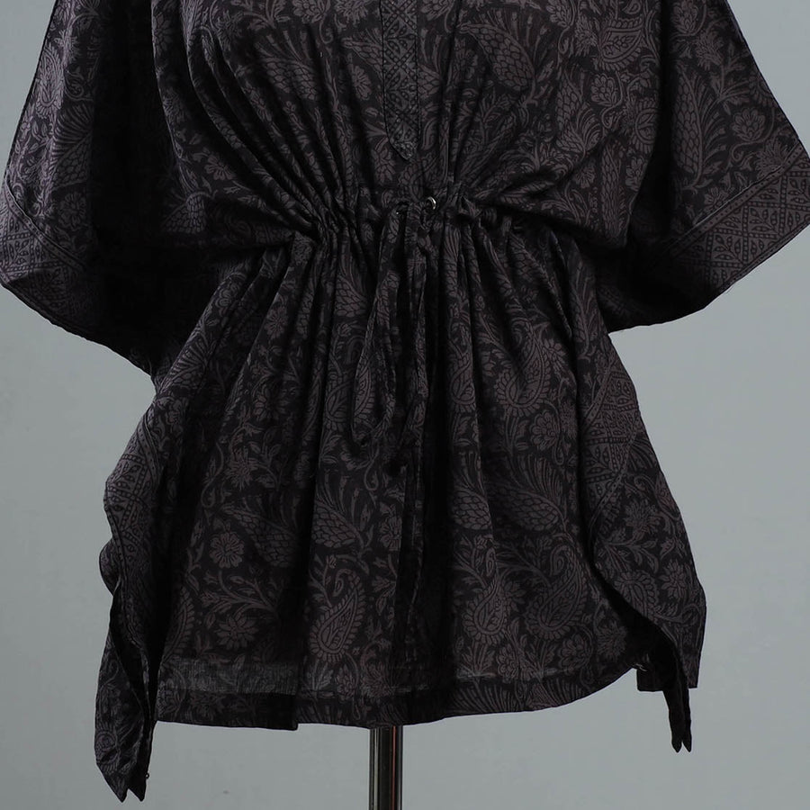Fine quality bagh hand block printed cotton short kaftan with adjustable drawstring waist tie. A traditional kaftan or caftan is a short-length garment with long, flowing sleeves. These loose-fitting cotton kaftans are enhanced by a soft touch and beautiful hand-block prints. This dress will allow you to move with ease and comfort. The drawstring waist tie will give you the freedom to customize the fit to suit your unique shape. The kaftan is free-size and can be adjusted to perfection with the drawstring at the waist.
