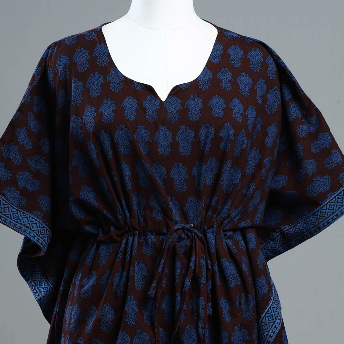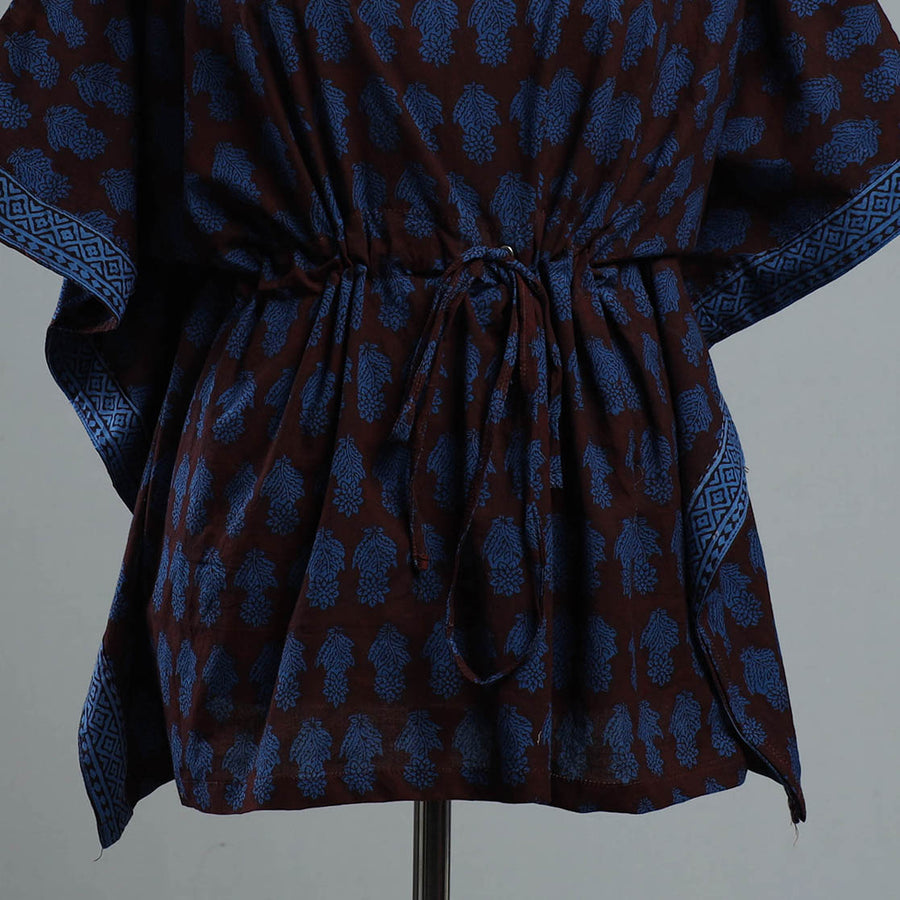 Fine quality bagh hand block printed cotton short kaftan with adjustable drawstring waist tie. A traditional kaftan or caftan is a short-length garment with long, flowing sleeves. These loose-fitting cotton kaftans are enhanced by a soft touch and beautiful hand-block prints. This dress will allow you to move with ease and comfort. The drawstring waist tie will give you the freedom to customize the fit to suit your unique shape. The kaftan is free-size and can be adjusted to perfection with the drawstring at the waist.