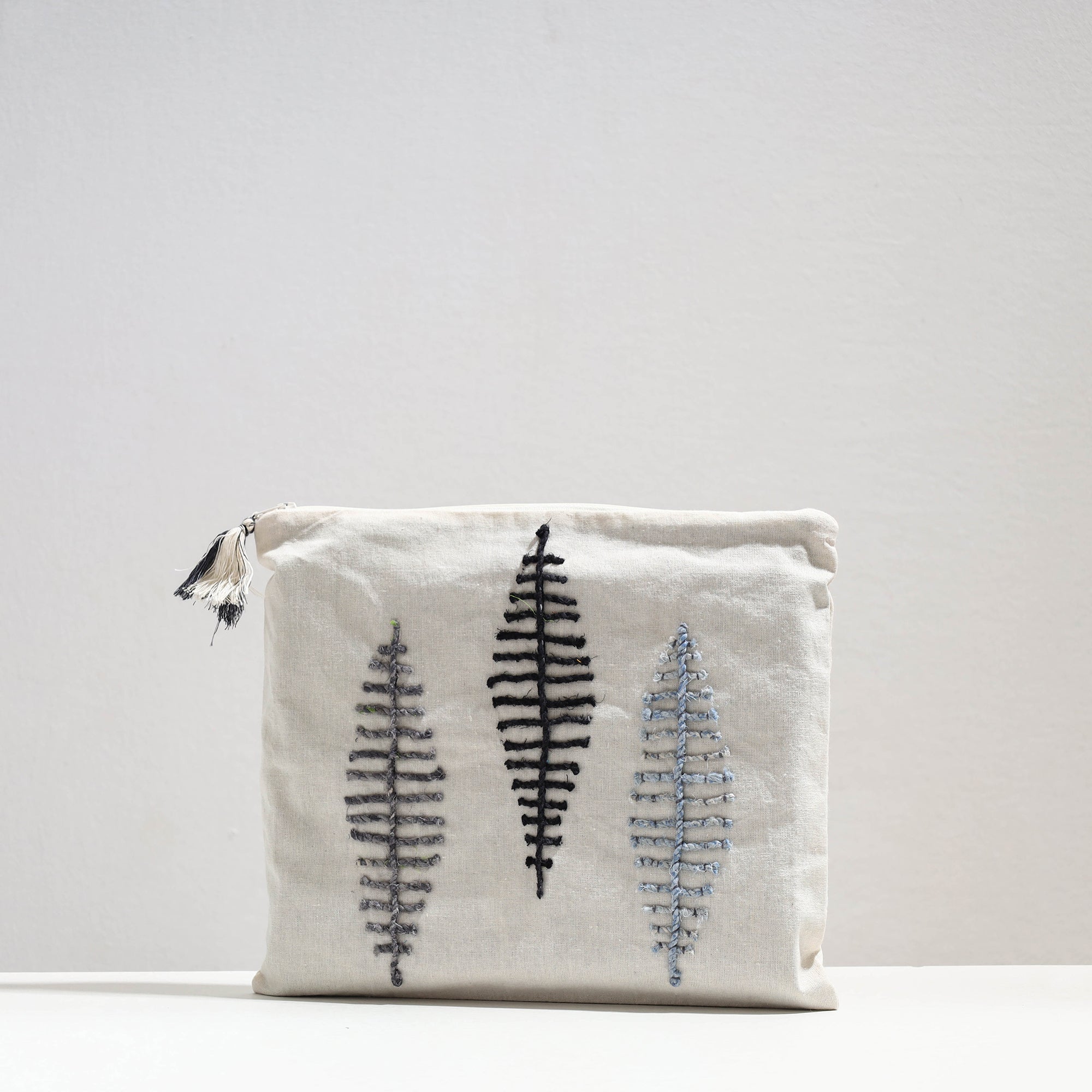 Handmade cotton recycled cord leaf design tablet pouch. The leaf design on this tablet pouch is made from recycled cord. Crafted from millmade cotton fabric, it's a sustainable choice. This pouch provides reliable protection for your tablet, blending practicality with a touch of nature-inspired design. Carry your tech in eco-friendly fashion.