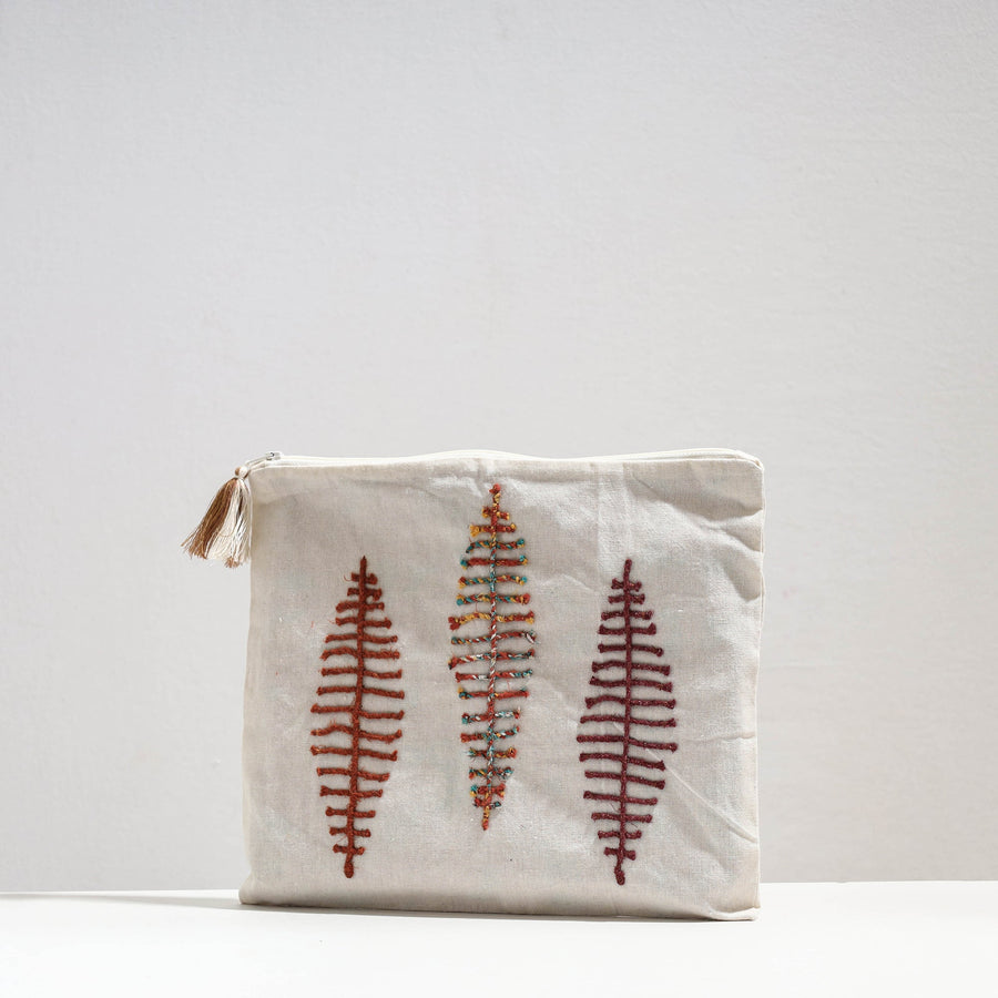 Handmade cotton recycled cord leaf design tablet pouch. The leaf design on this tablet pouch is made from recycled cord. Crafted from millmade cotton fabric, it's a sustainable choice. This pouch provides reliable protection for your tablet, blending practicality with a touch of nature-inspired design. Carry your tech in eco-friendly fashion.