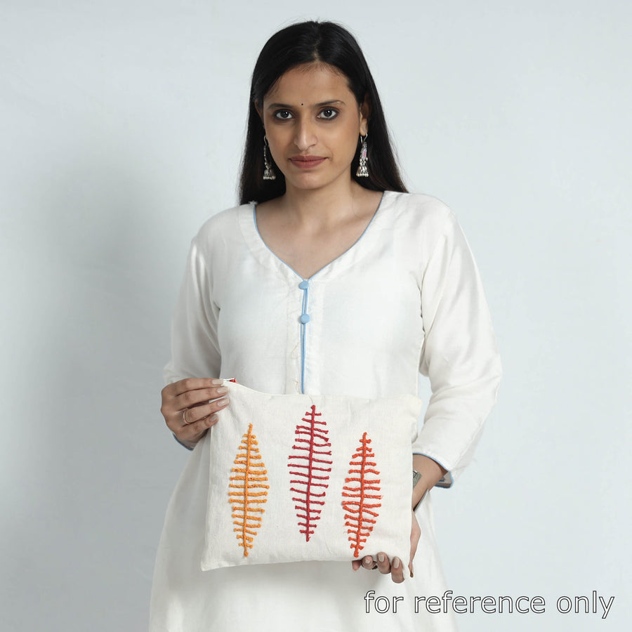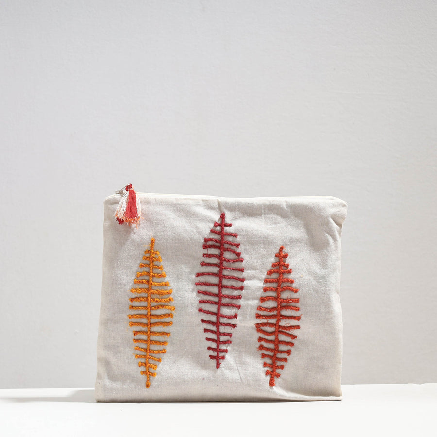 Handmade cotton recycled cord leaf design tablet pouch. The leaf design on this tablet pouch is made from recycled cord. Crafted from millmade cotton fabric, it's a sustainable choice. This pouch provides reliable protection for your tablet, blending practicality with a touch of nature-inspired design. Carry your tech in eco-friendly fashion.