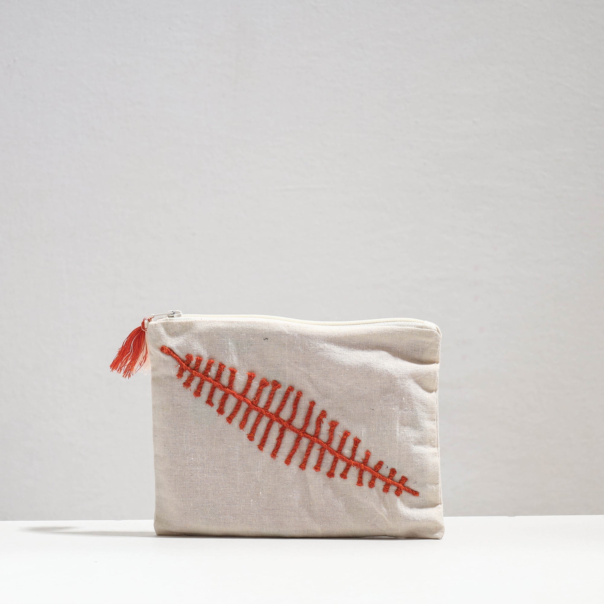 Handmade cotton recycled cord leaf design cosmetic pouch. The leaf design on this cosmetic pouch is made from recycled cord. Crafted from millmade cotton fabric, it's a sustainable choice. Whether you use it as a makeup pouch, travel organizer, or for everyday use, this utility pouch is a perfect blend of fashion and functionality. Carry your essentials in this charming pouch and add a touch of handmade luxury to your daily routine.