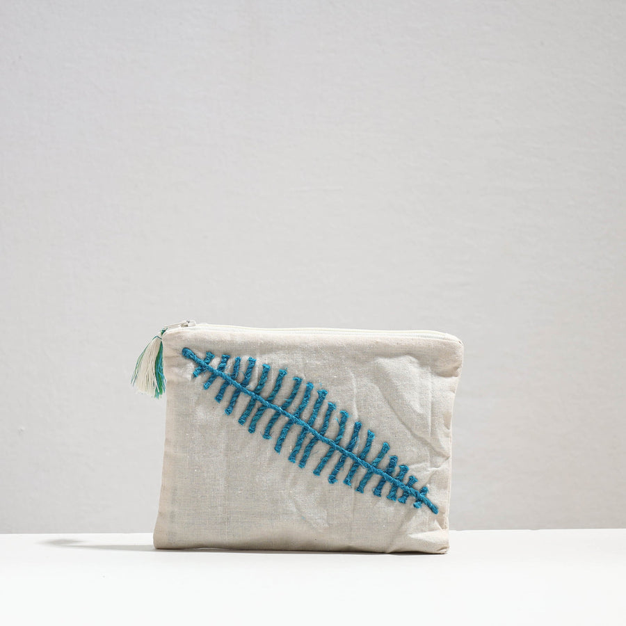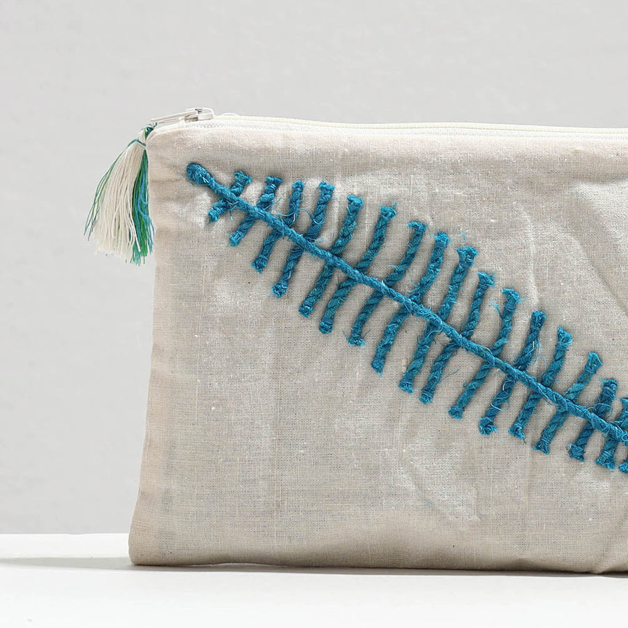 Handmade cotton recycled cord leaf design cosmetic pouch. The leaf design on this cosmetic pouch is made from recycled cord. Crafted from millmade cotton fabric, it's a sustainable choice. Whether you use it as a makeup pouch, travel organizer, or for everyday use, this utility pouch is a perfect blend of fashion and functionality. Carry your essentials in this charming pouch and add a touch of handmade luxury to your daily routine.