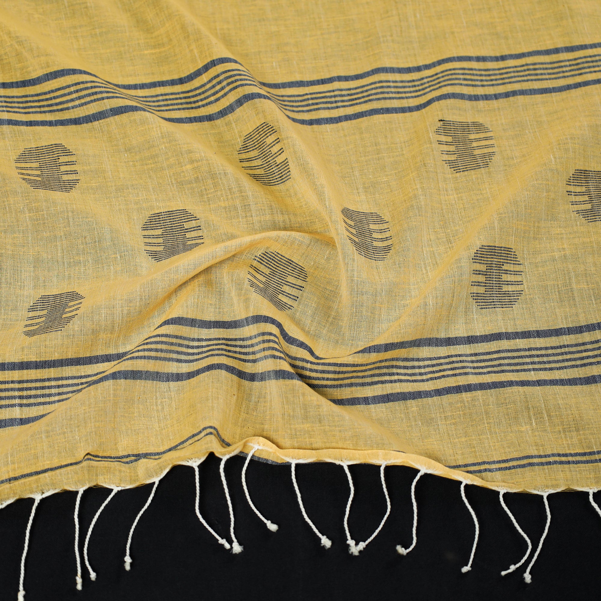 This exquisite burdwan jamdani buti handloom pure cotton stole with tassels is crafted by the artisans of Bengal. Jamdani (extra weft) weaving, a style unique to Bengal…literally like "hand embroidery" on the loom. The method of weaving resembles tapestry work, in which small shuttles of coloured, gold, or silver threads are passed through the warp.