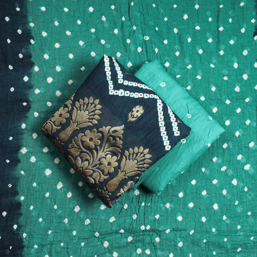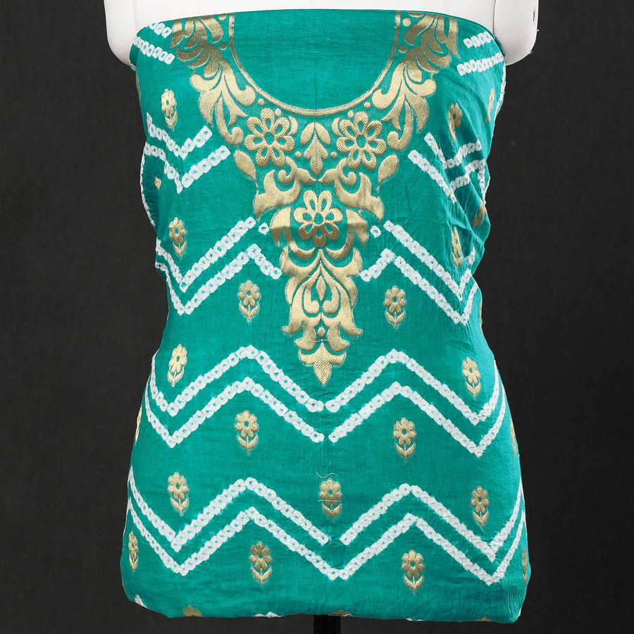 This kutch bandhani tie-dye heavy zari work 3-piece suit material set is crafted using high-quality materials to ensure both comfort and durability. The kurti and bottom are made from satin cotton, and the dupatta is made from mul cotton. This suit material features a majestic bandhani pattern, tie-dyed using the traditional technique practised by the artisans of Kutch. This process begins by tightly tying the fabric with a thread at several points, creating patterns and motifs. The tie-dye effect, along with the addition of zari work, enhances the overall beauty of the ensemble, adding a touch of opulence and glamour.