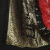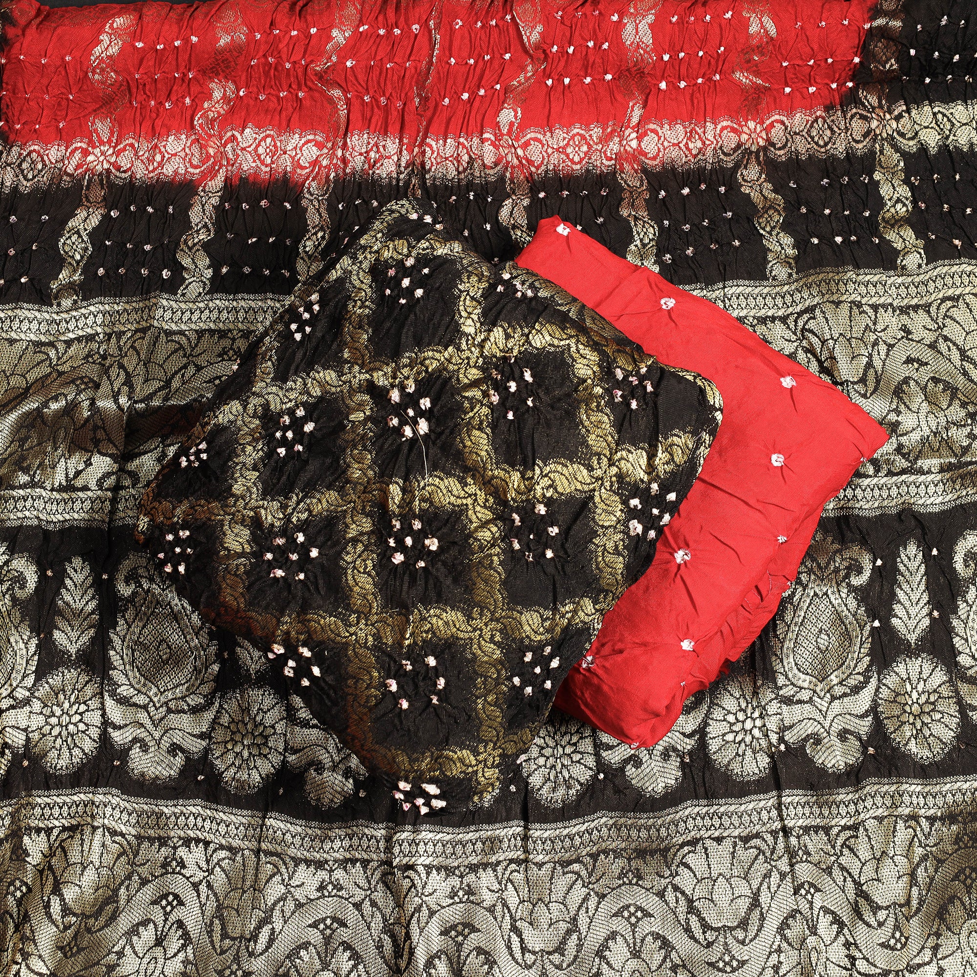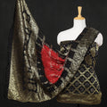 This black kutch bandhani tie-dye jacquard silk heavy zari work 3-piece suit material. set crafted is Jacquard silk is a high-quality fabric known for its intricate woven patterns. It often features raised designs that add depth and texture to the fabric.This suit material features a majestic bandhani pattern, tie-dyed using the traditional technique practised by the artisans of Kutch. This process begins by tightly tying the fabric with a thread at several points, creating patterns and motifs. The tie-dye effect, along with the addition of zari work, enhances the overall beauty of the ensemble, adding a touch of opulence and glamour.