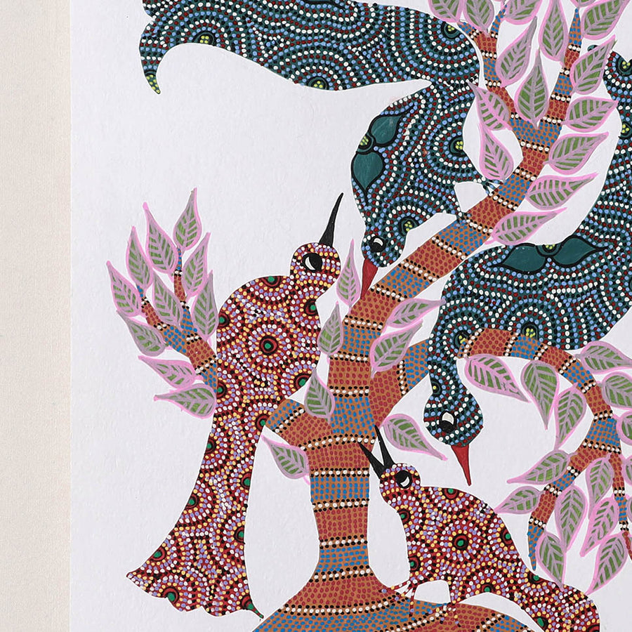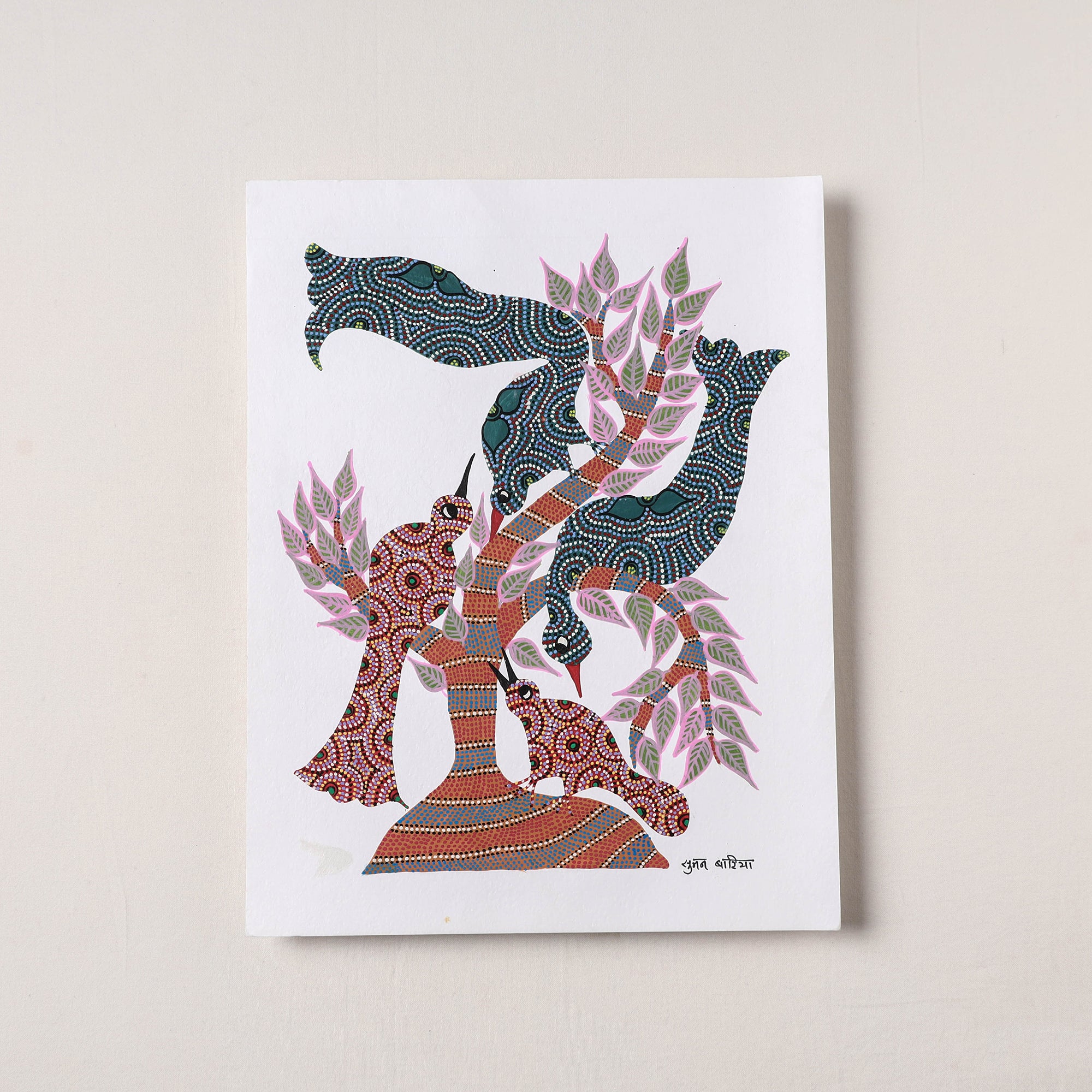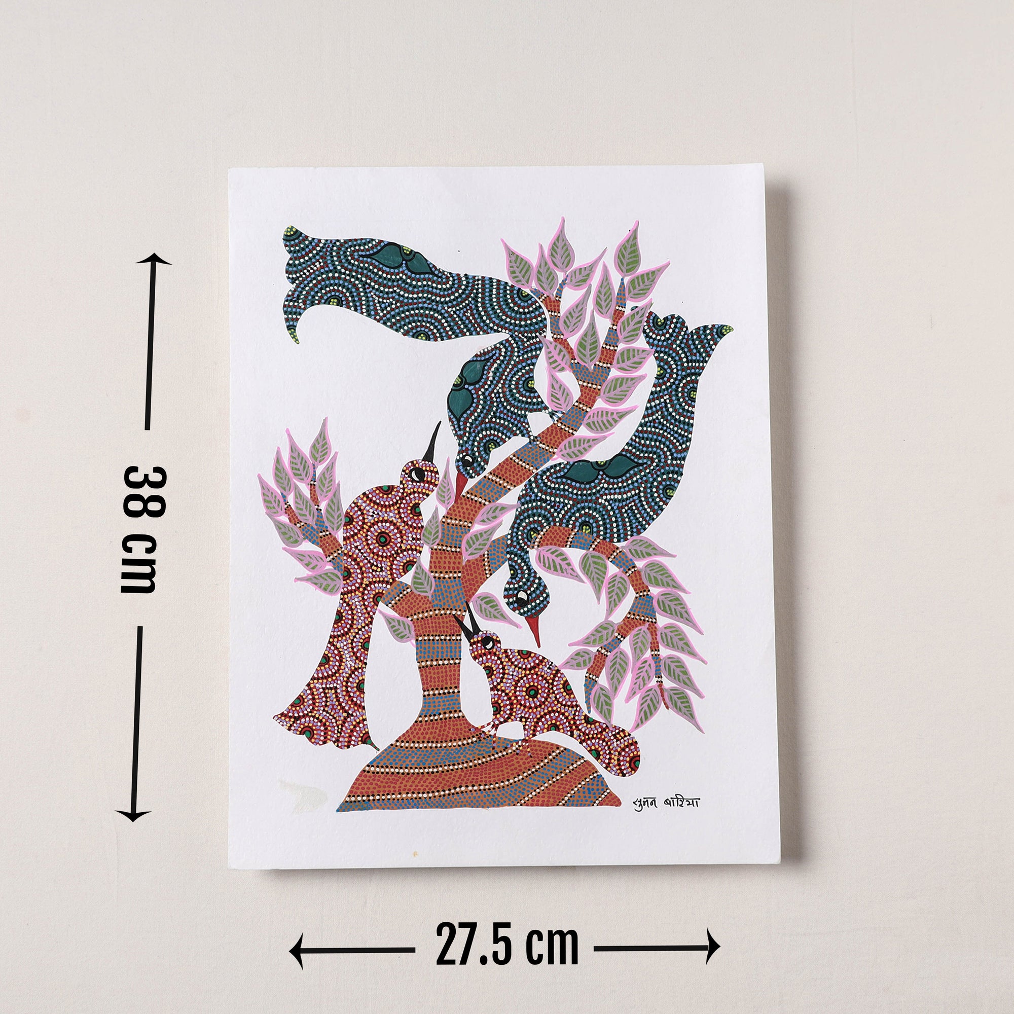 Traditional bhil pithora folk artwork on thick art paper with permanent ink & acrylic colours. This exquisite bhil art comes from the family of Geeta Bariya. Geeta is the daughter in law of Bhuribai famous Bhil artist. She learnt painting after she got married. She has participated in various workshops. The Bhils are the second largest tribe in India who reside in western and central India, in states of Madhya Pradesh, Gujarat, Rajasthan, and Maharashtra. The history of Bhil art is as old as the Bhils themselves. The art is simple images of everyday life of this tribe, the Bhils live close to nature and lead a largely agricultural life. Their paintings reflect the changing seasons, the natural phenomena that guide their harvest, and the gods that protect them. Their houses have beautiful frescos of images from myth and folklore on the walls and ceilings. Dots are the identity of Bhil art paintings. Dots of different colours on plain backgrounds are used to depict stories, memories and prayers.