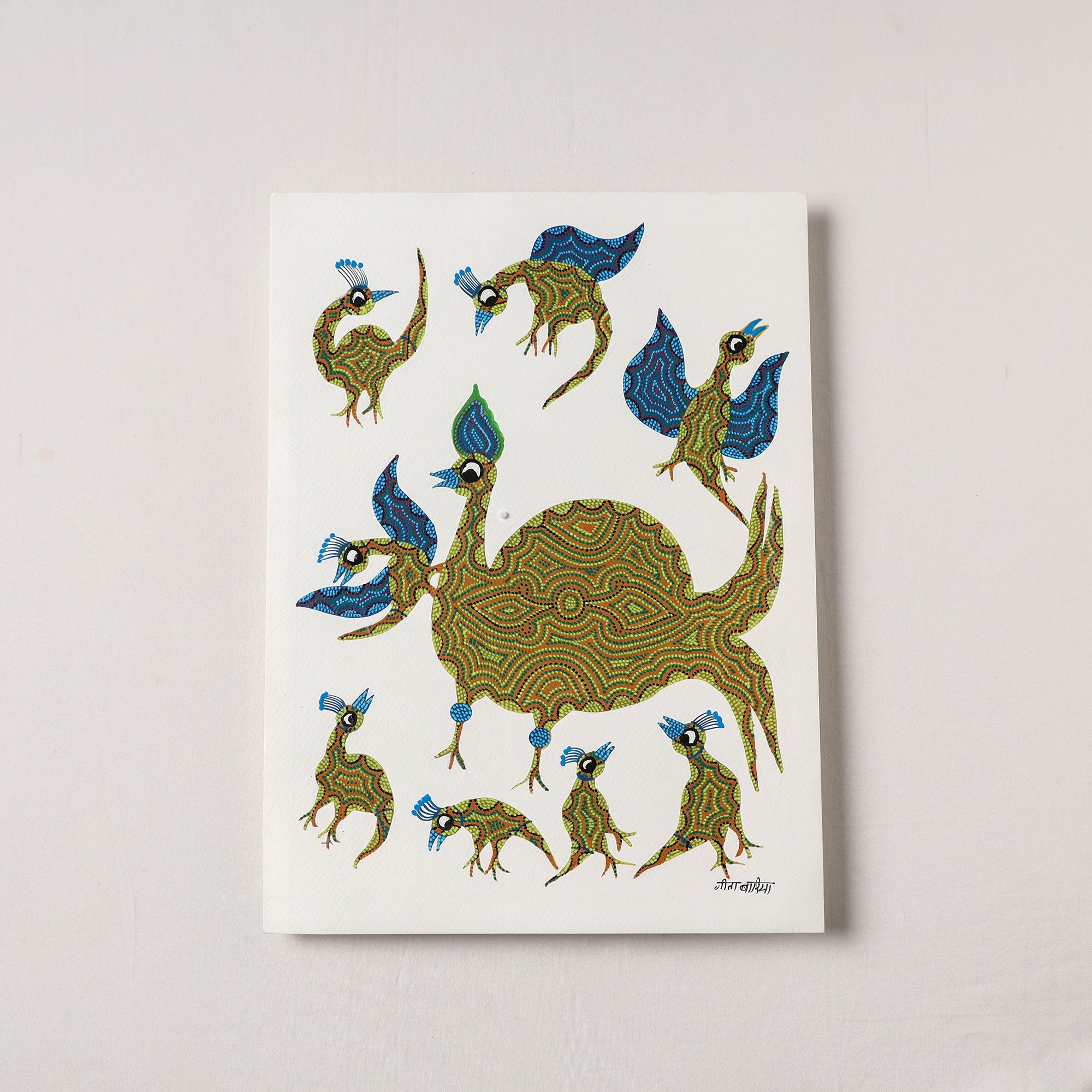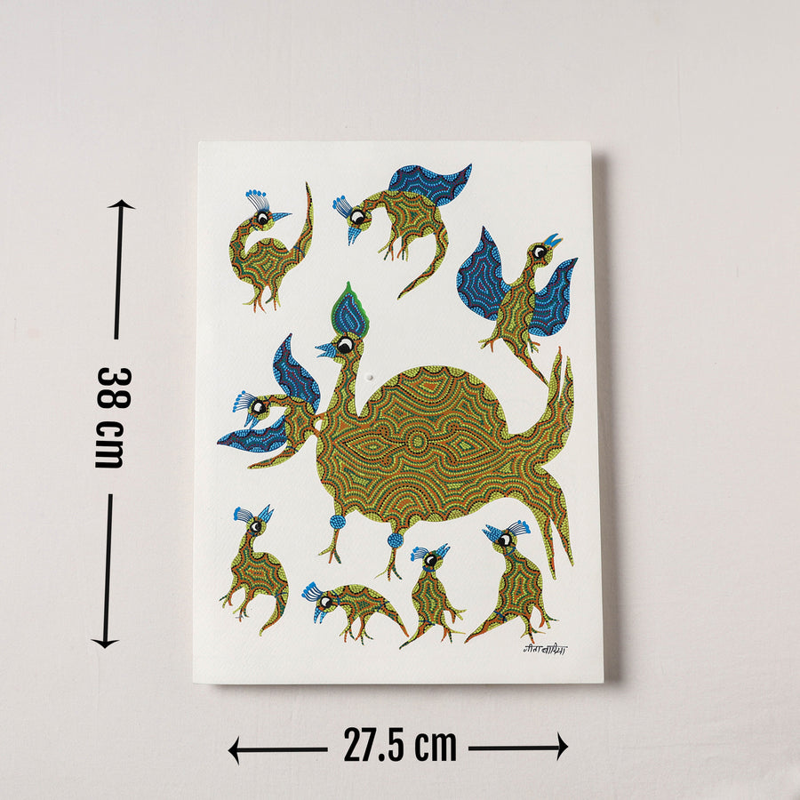 Traditional bhil pithora folk artwork on thick art paper with permanent ink & acrylic colours. This exquisite bhil art comes from the family of Geeta Bariya. Geeta is the daughter in law of Bhuribai famous Bhil artist. She learnt painting after she got married. She has participated in various workshops. The Bhils are the second largest tribe in India who reside in western and central India, in states of Madhya Pradesh, Gujarat, Rajasthan, and Maharashtra. The history of Bhil art is as old as the Bhils themselves. The art is simple images of everyday life of this tribe, the Bhils live close to nature and lead a largely agricultural life. Their paintings reflect the changing seasons, the natural phenomena that guide their harvest, and the gods that protect them. Their houses have beautiful frescos of images from myth and folklore on the walls and ceilings. Dots are the identity of Bhil art paintings. Dots of different colours on plain backgrounds are used to depict stories, memories and prayers.
