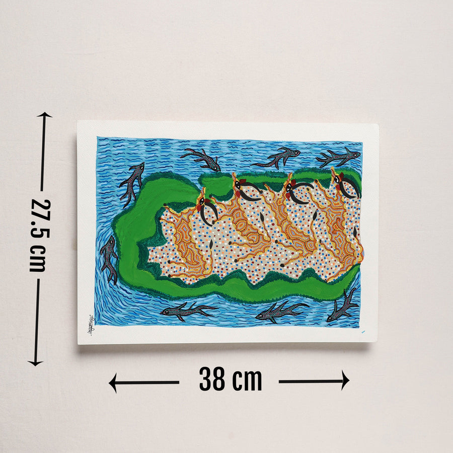Traditional bhil pithora folk artwork on thick art paper with permanent ink & acrylic colours. This exquisite bhil art comes from the family of Geeta Bariya. Geeta is the daughter in law of Bhuribai famous Bhil artist. She learnt painting after she got married. She has participated in various workshops. The Bhils are the second largest tribe in India who reside in western and central India, in states of Madhya Pradesh, Gujarat, Rajasthan, and Maharashtra. The history of Bhil art is as old as the Bhils themselves. The art is simple images of everyday life of this tribe, the Bhils live close to nature and lead a largely agricultural life. Their paintings reflect the changing seasons, the natural phenomena that guide their harvest, and the gods that protect them. Their houses have beautiful frescos of images from myth and folklore on the walls and ceilings. Dots are the identity of Bhil art paintings. Dots of different colours on plain backgrounds are used to depict stories, memories and prayers.
