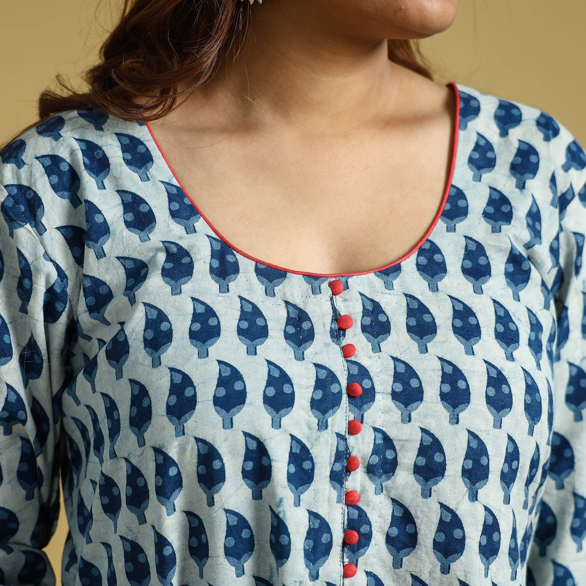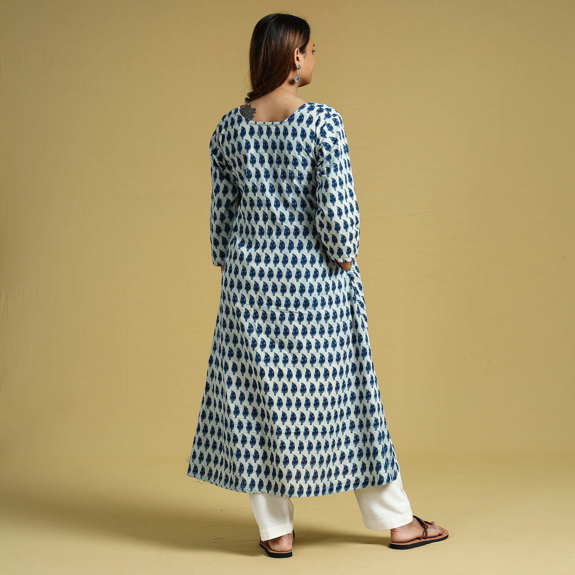 This uniquely designed indigo hand block printed cotton long kurta is a perfect blend of style and comfort. This kurta is crafted from indigo block printed cotton fabric, ensuring a comfortable feel against your skin. The kurta also features a convenient one-side pocket, perfect for carrying small essentials. This cotton kurta makes you comfortable all day long. This kurta is perfect for your daily outing and for a special occasion. “Neelसी” is an in-house curated sustainable indigo clothing brand. Neelसी finds its inspiration from the 2000-year-old tradition of the natural dying of textiles in India. Neelसी natural cotton fabric clothing is perfect for summers, which are as light as air, dyed with natural colours of love and emotions, reimagining and redefining the timeless era.