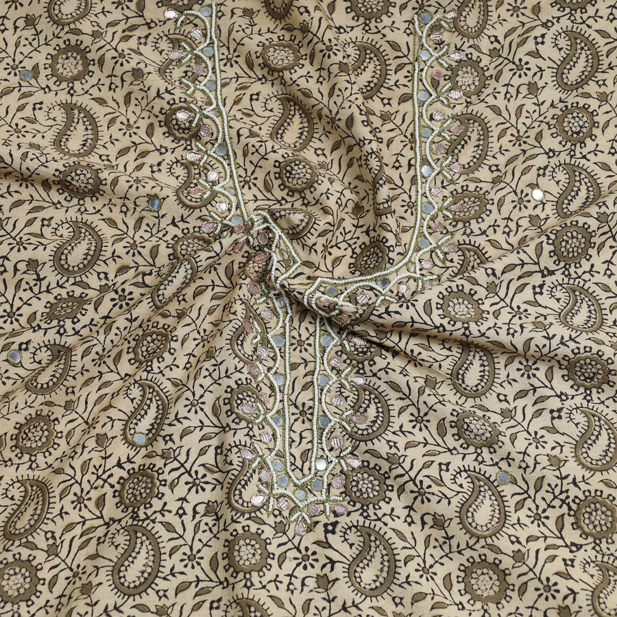 Fine quality bead work, hand embroidery, kalamkari block printed, cotton kurta material made using natural dyes through the traditional process of hand block printed practised by the master artisans. Showcasing an assortment of hand block printed motifs inspired by traditional kalamkari painted. Kalamkari is the earliest and more complex techniques of block-printed.