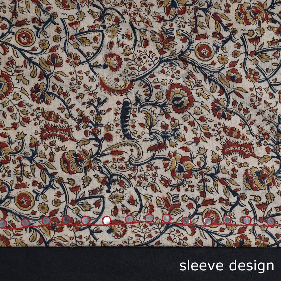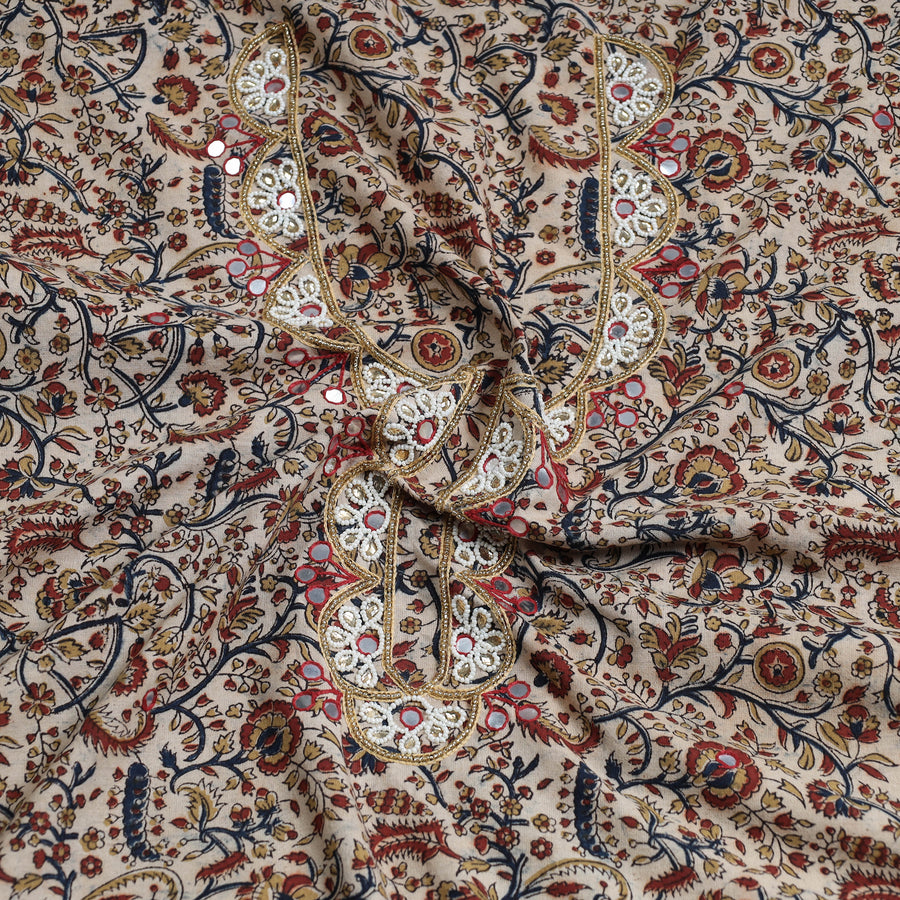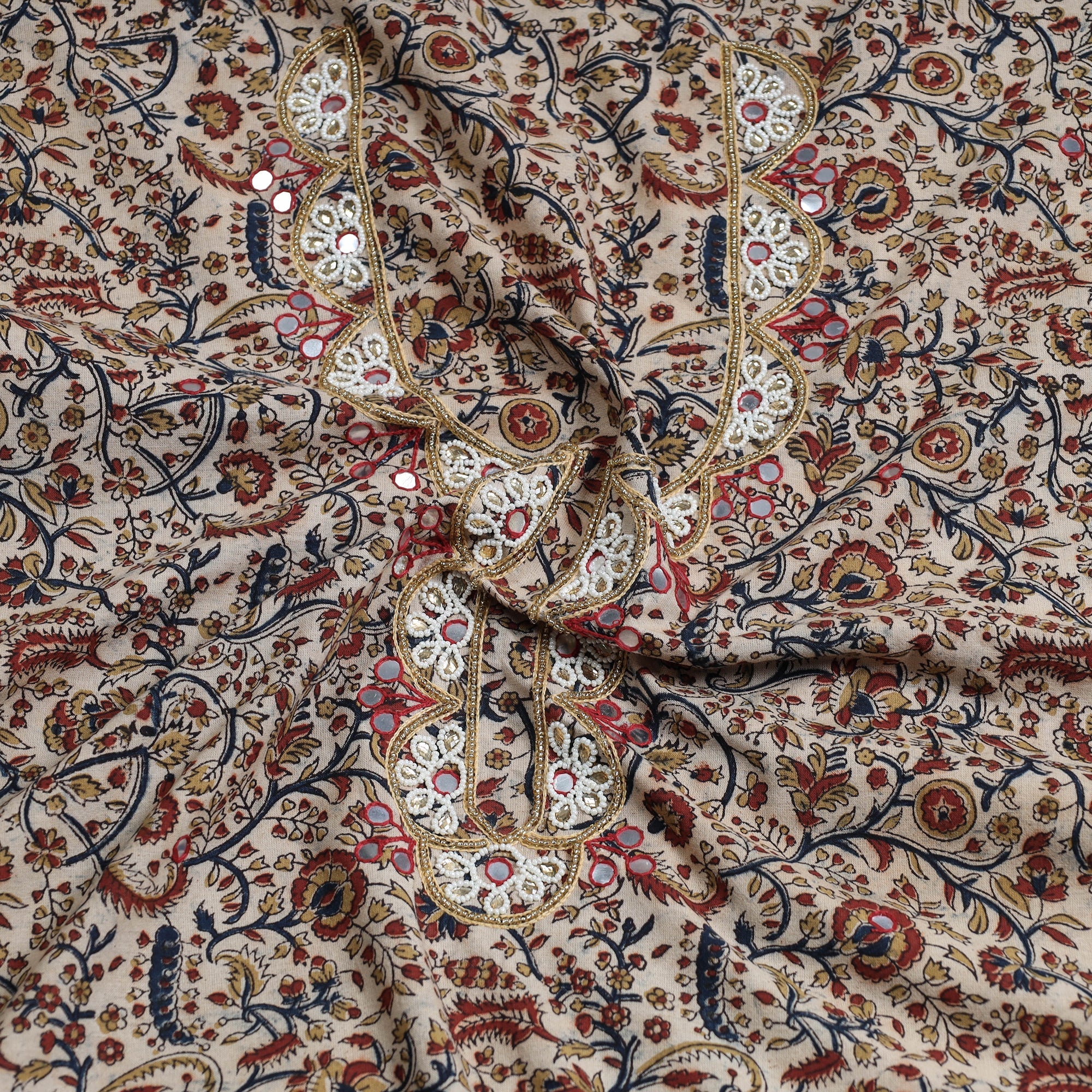 Fine quality bead work, hand embroidery, kalamkari block printed, cotton kurta material made using natural dyes through the traditional process of hand block printed practised by the master artisans. Showcasing an assortment of hand block printed motifs inspired by traditional kalamkari painted. Kalamkari is the earliest and more complex techniques of block-printed.