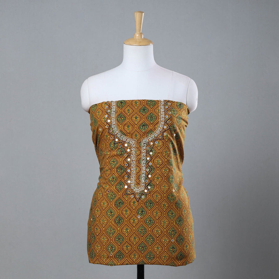 Fine quality ajrakh block printed bead work hand embroidery cotton kurta material made using natural dyes through the traditional process of hand block printed practiced by the master artisans. Beadwork embellishments are added with meticulous hand embroidery, ensuring each piece is a work of art. Perfect for crafting stunning kurtas, this kurta material allows you to embrace tradition and elegance.