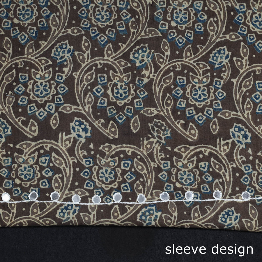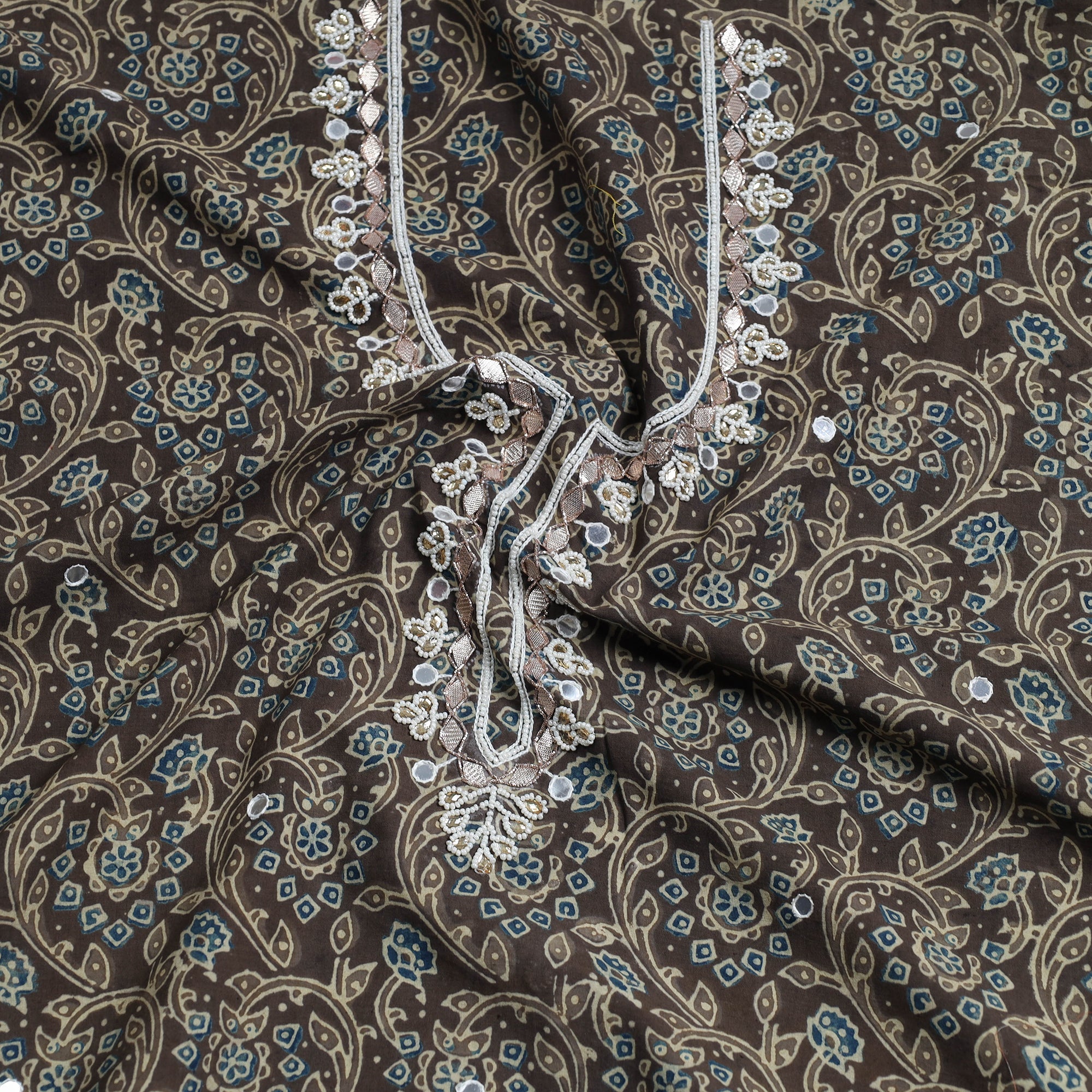 Fine quality gota patti with bead work, hand embroidery ajrakh block printed cotton kurta material made using natural dyes through traditional ajrakh technique of hand-block printing practised by the artisans. Gota Patti is a traditional Indian embroidery technique that involves the use of metallic ribbon or lace.This ribbon or lace is stitched onto the fabric to create intricate patterns and designs Beadwork involves the addition of small beads, sequins.