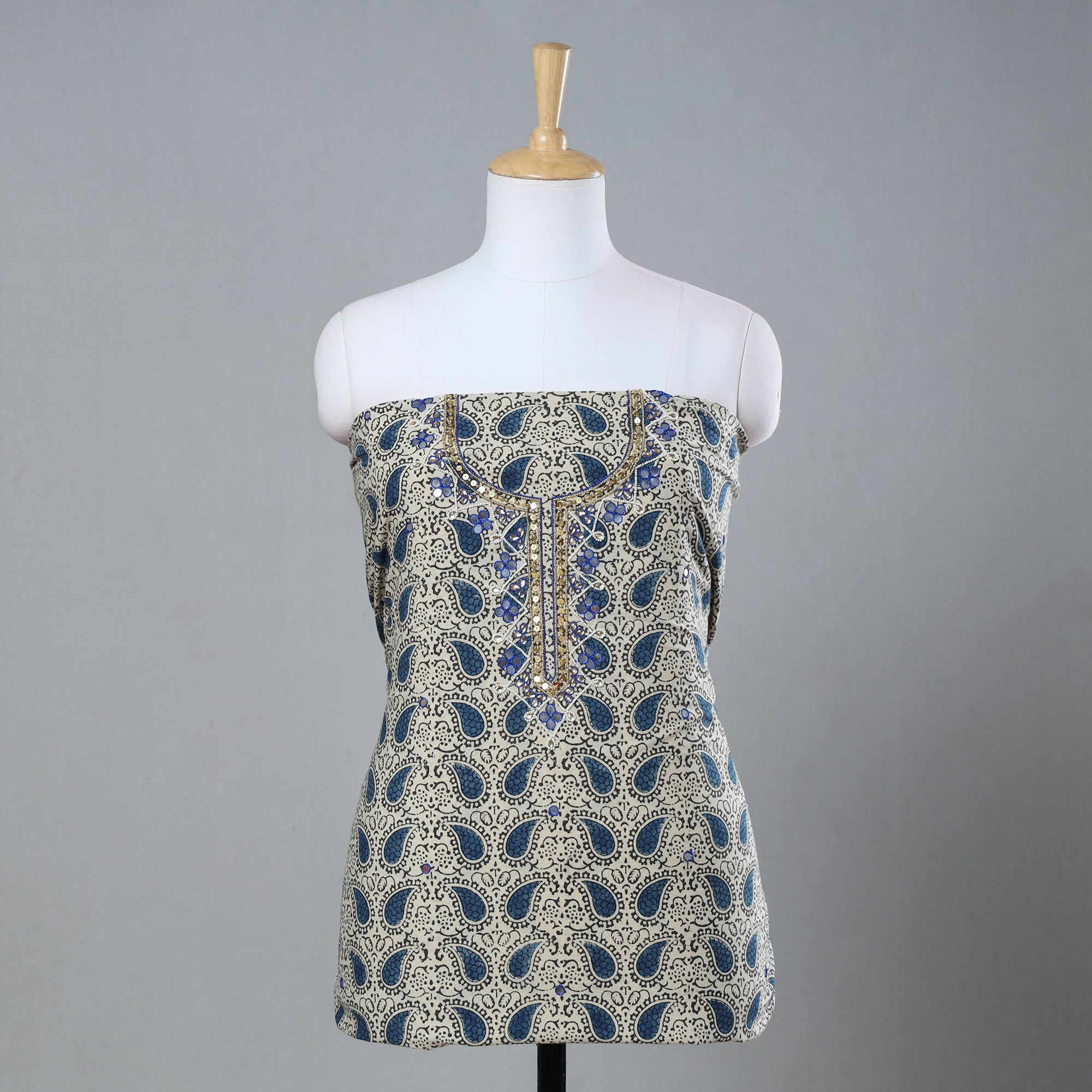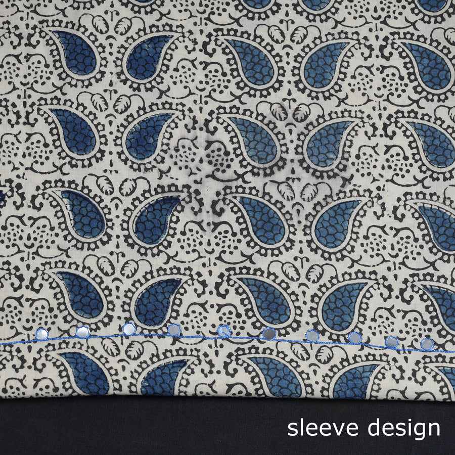 Fine quality bead work, hand embroidery, kalamkari block printed, cotton kurta material made using natural dyes through the traditional process of hand block printed practised by the master artisans. Showcasing an assortment of hand block printed motifs inspired by traditional kalamkari painted. Kalamkari is the earliest and more complex techniques of block-printed.