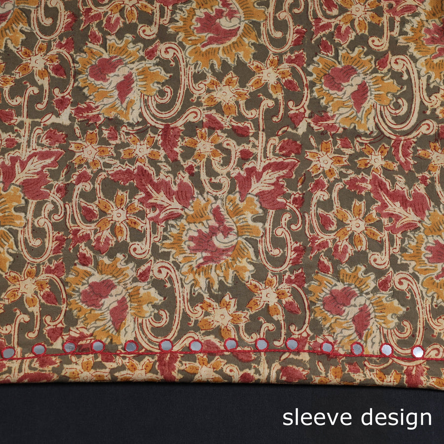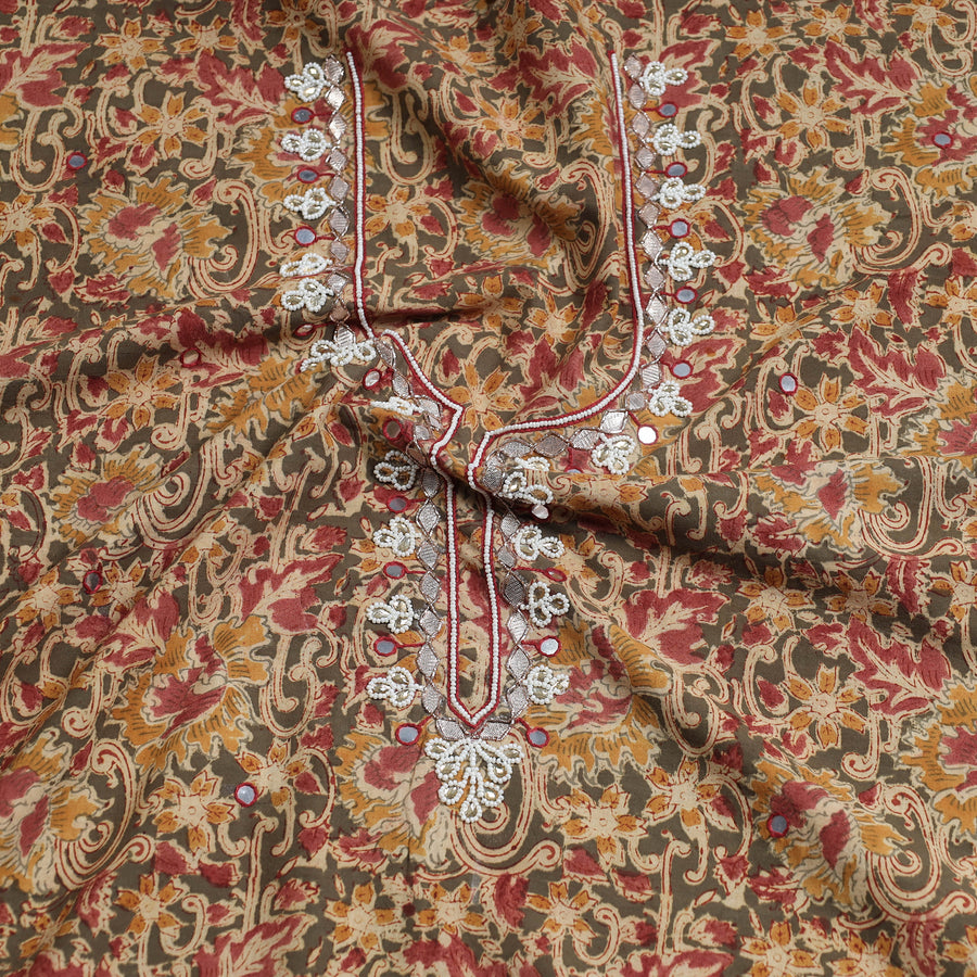 Fine quality bead work, hand embroidery, kalamkari block printed, cotton kurta material made using natural dyes through the traditional process of hand block printed practised by the master artisans. Showcasing an assortment of hand block printed motifs inspired by traditional kalamkari painted. Kalamkari is the earliest and more complex techniques of block-printed.