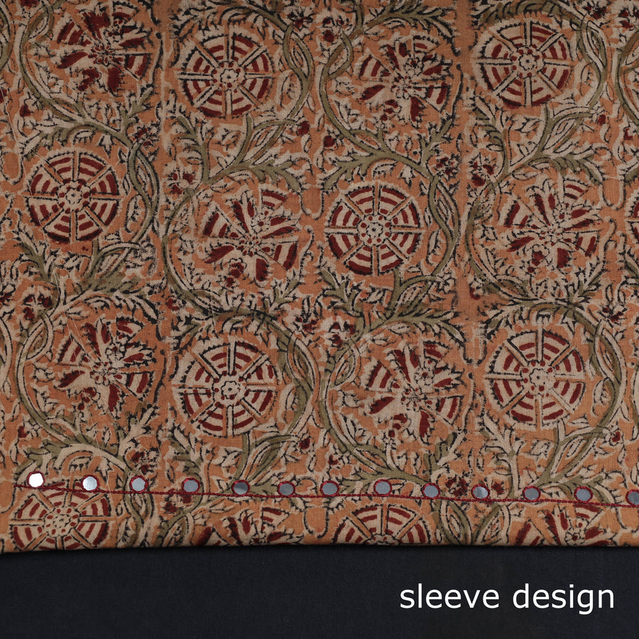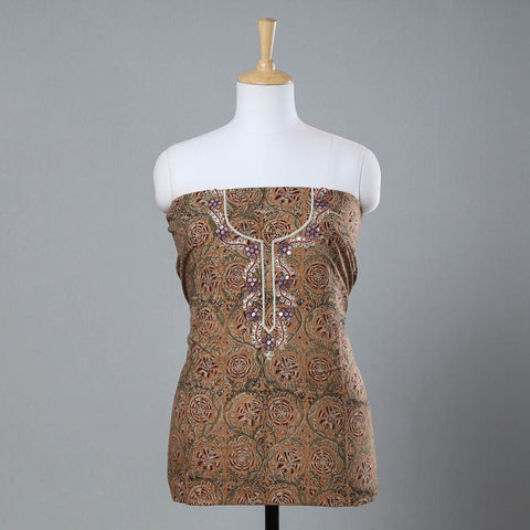 Fine quality bead work, hand embroidery, kalamkari block printed, cotton kurta material made using natural dyes through the traditional process of hand block printed practised by the master artisans. Showcasing an assortment of hand block printed motifs inspired by traditional kalamkari painted. Kalamkari is the earliest and more complex techniques of block-printed.
