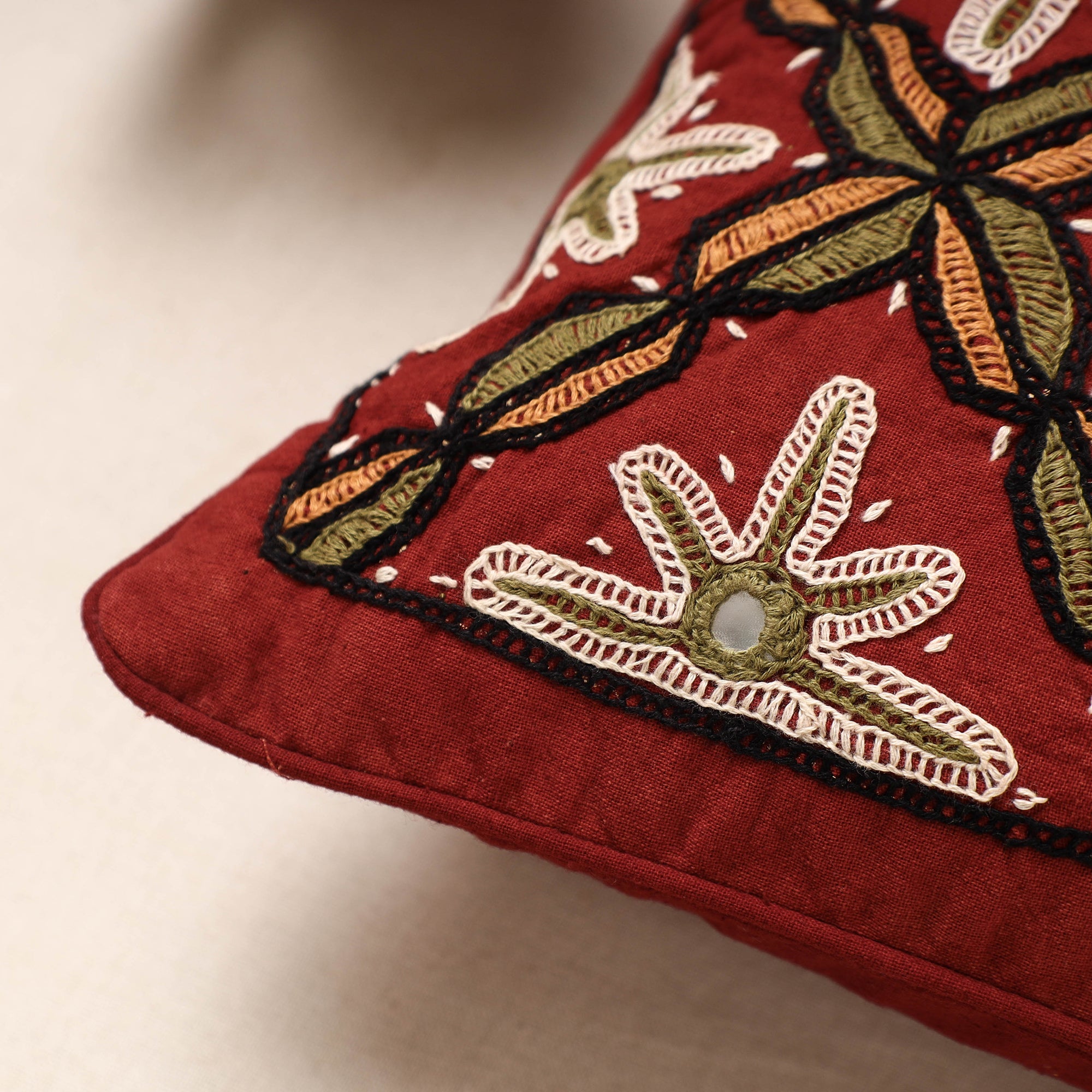 Fine quality red pakko hand embroidery mirror work cotton cushion cover. This cushion cover is made from cotton fabric with beautiful Pakko embroidery by artisans of Kala Raksha. Paako literally solid, is a tight square chain and double buttonhole stitch embroidery, often with black slanted satin stitch outlining. The motifs of paako, sketched in mud with needles, are primarily floral and generally arranged in symmetrical patterns.