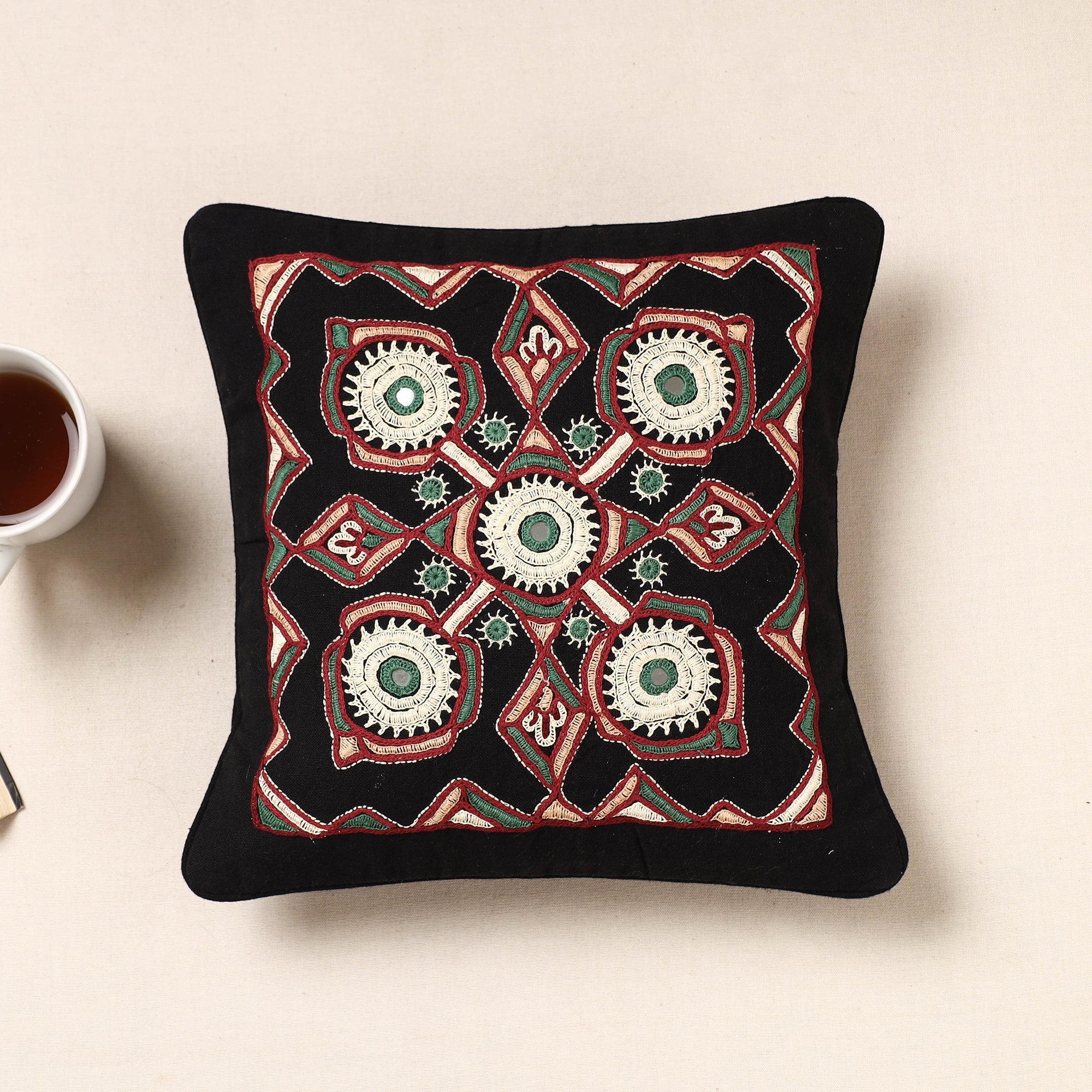 Fine quality black pakko hand embroidery mirror work pure cotton cushion cover. This cushion cover is made from cotton fabric with beautiful Pakko embroidery by artisans of Kala Raksha. Paako literally solid, is a tight square chain and double buttonhole stitch embroidery, often with black slanted satin stitch outlining. The motifs of paako, sketched in mud with needles, are primarily floral and generally arranged in symmetrical patterns.