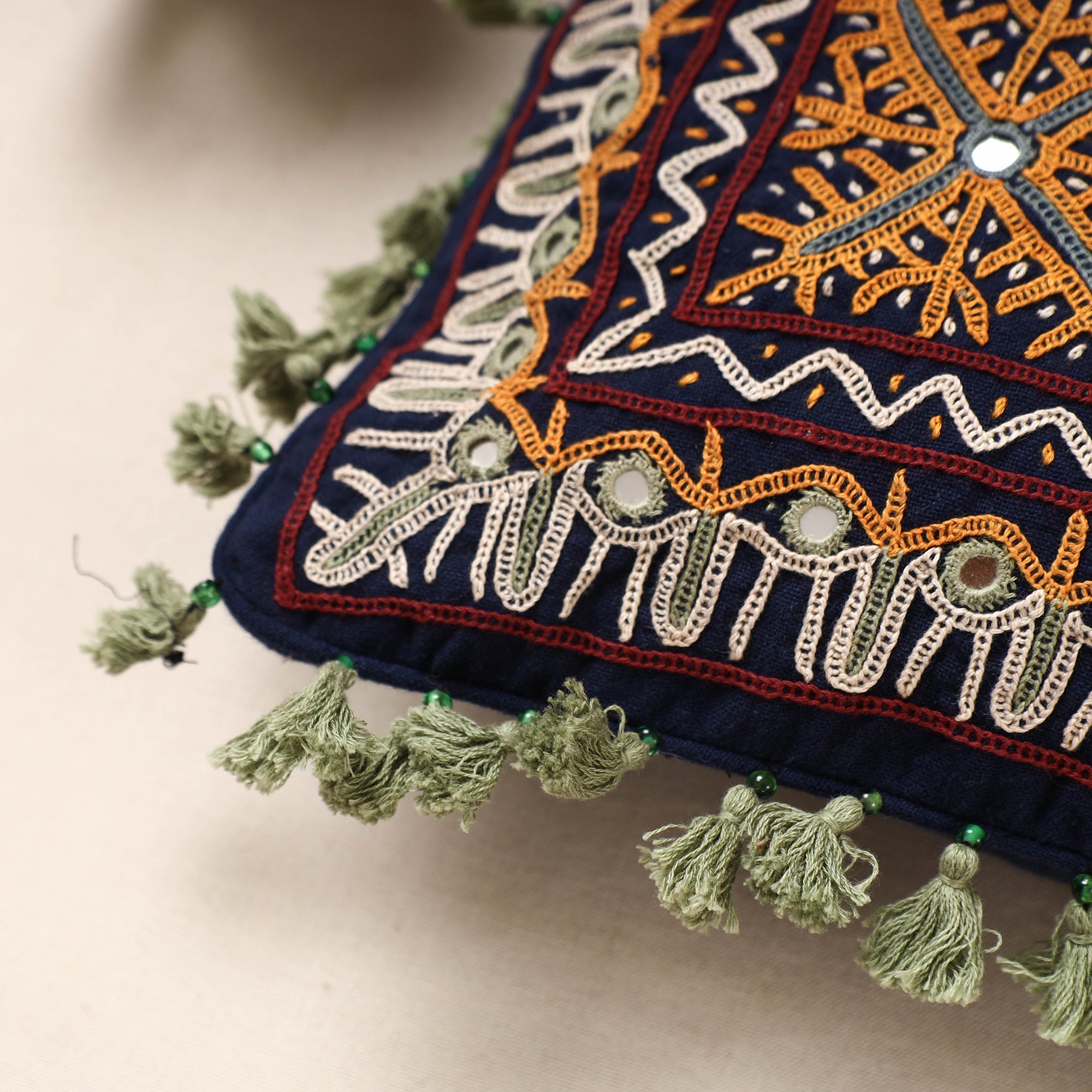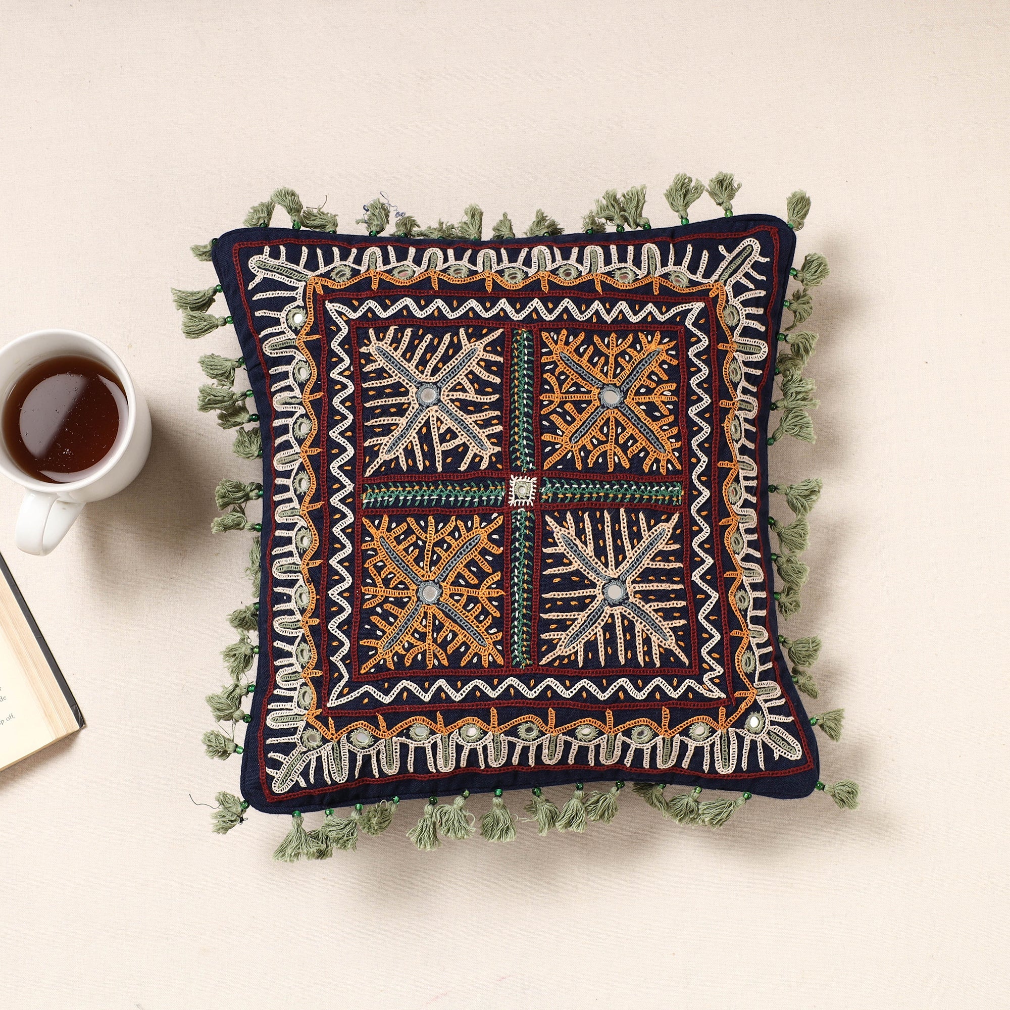 Fine quality black rabari hand embroidery cotton cushion cover. This cushion cover is made from cotton fabric with beautiful Rabari embroidery by artisans of Kala Raksha. Rabari embroidery is unique to the nomadic Rabaris. Essential to Rabari embroidery is the use of mirrors in a variety of shapes. Rabaris outline patterns in chain stitch, then decorate them with a regular sequence of mirrors and accent stitches, in a regular sequence of colors. Rabaris also use decorative back stitching, called bakhiya.