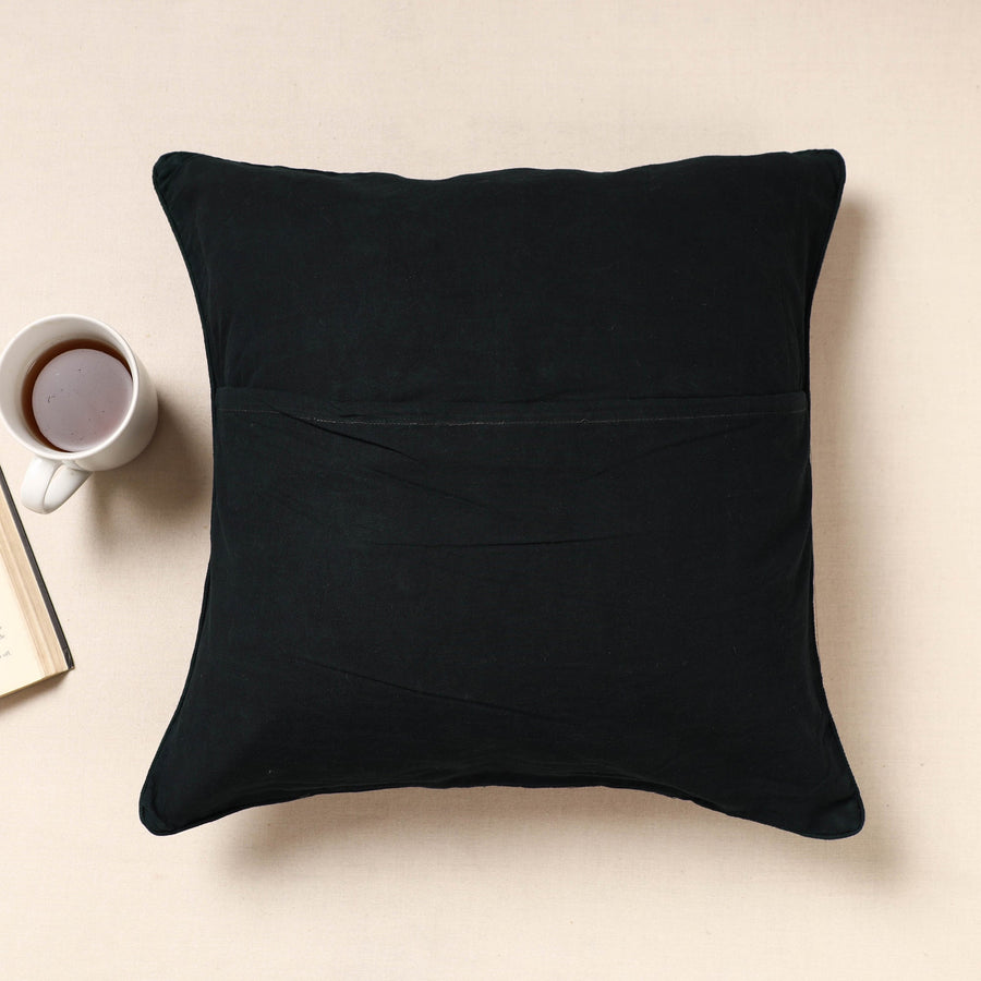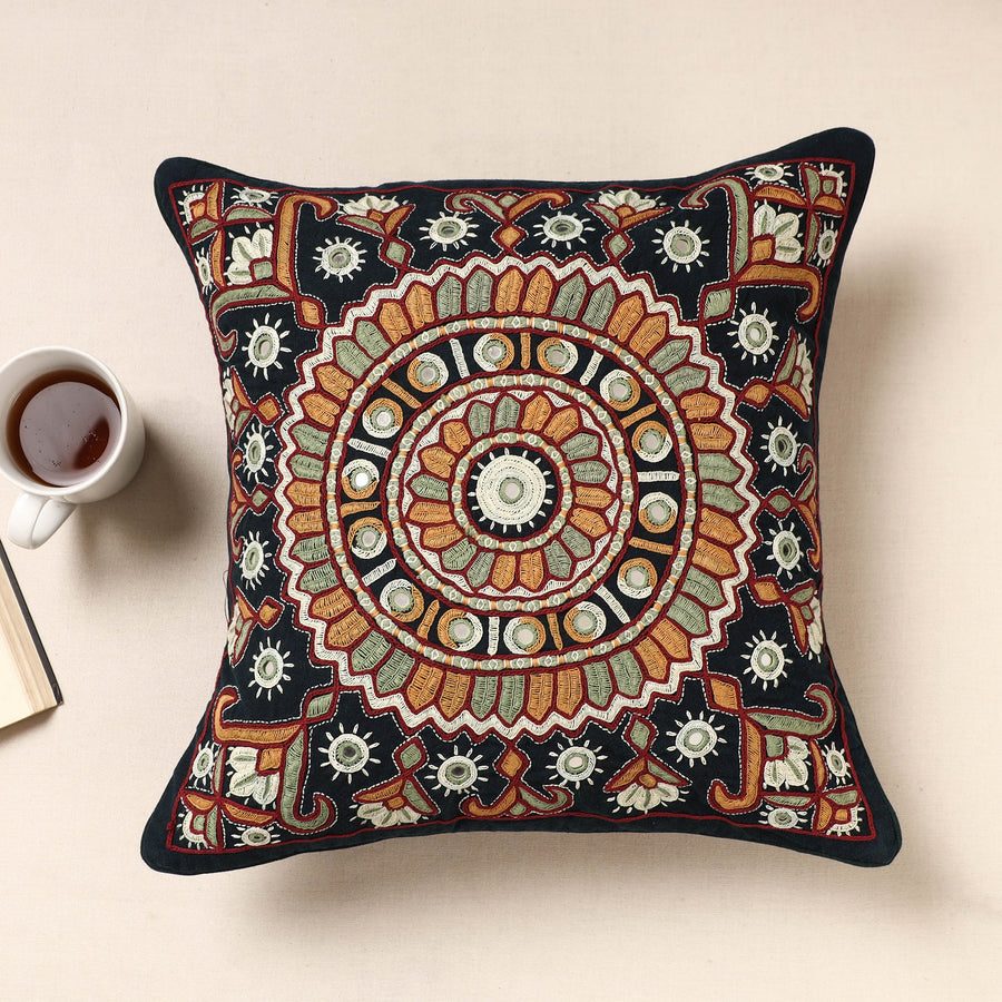 Fine quality back pakko hand embroidery mirror work cotton cushion cover. This cushion cover is made from cotton fabric with beautiful Pakko embroidery by artisans of Kala Raksha. Paako literally solid, is a tight square chain and double buttonhole stitch embroidery, often with black slanted satin stitch outlining. The motifs of paako, sketched in mud with needles, are primarily floral and generally arranged in symmetrical patterns.